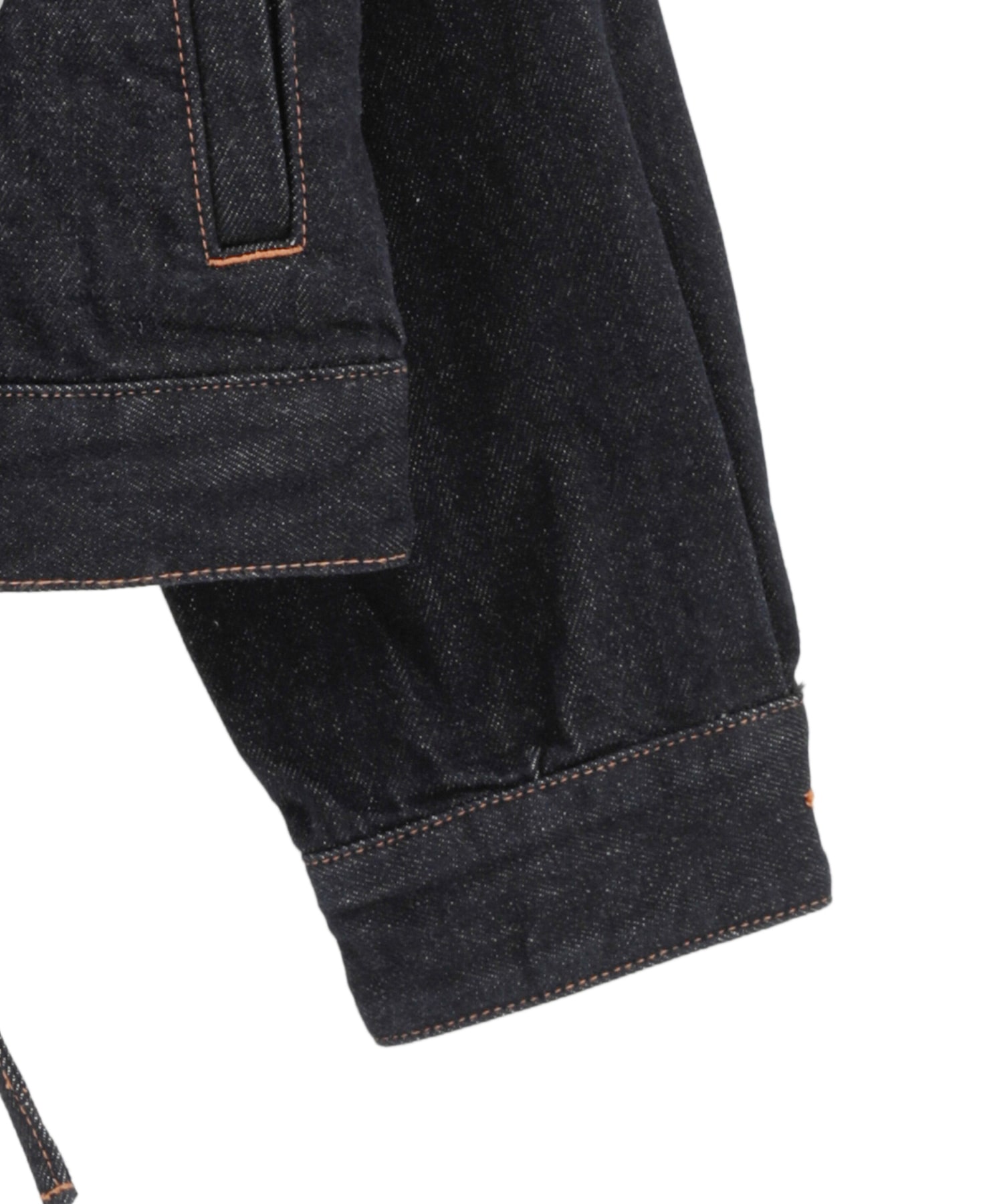 リジットデニムならではの濃紺の色味と、張りのある質感がモードな雰囲気を演出し、シンプルながらも存在感のある仕上がりに。