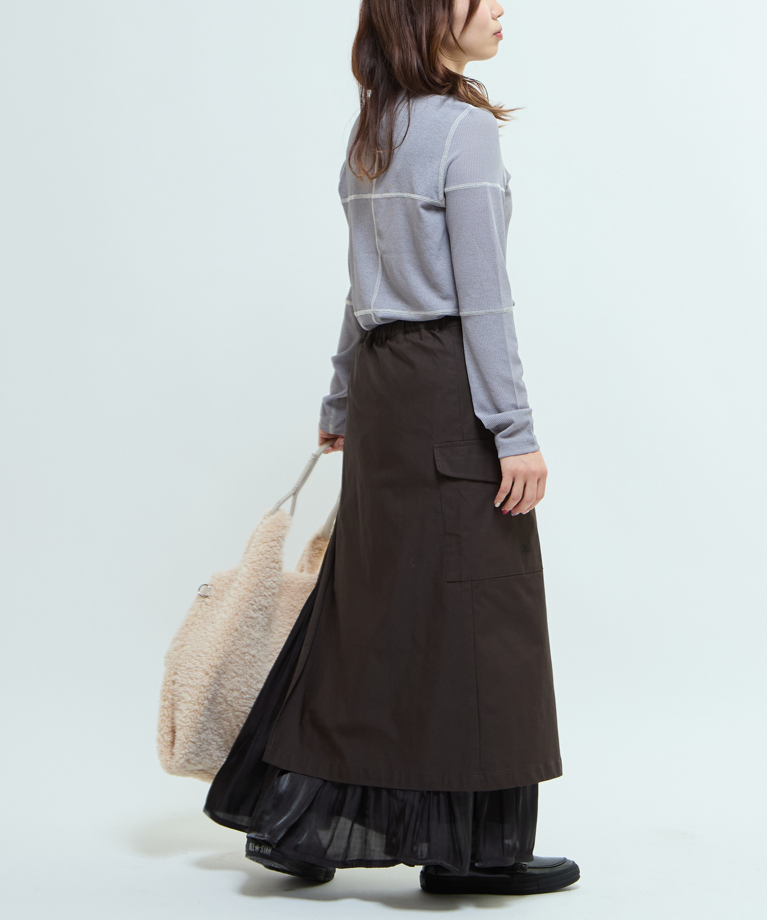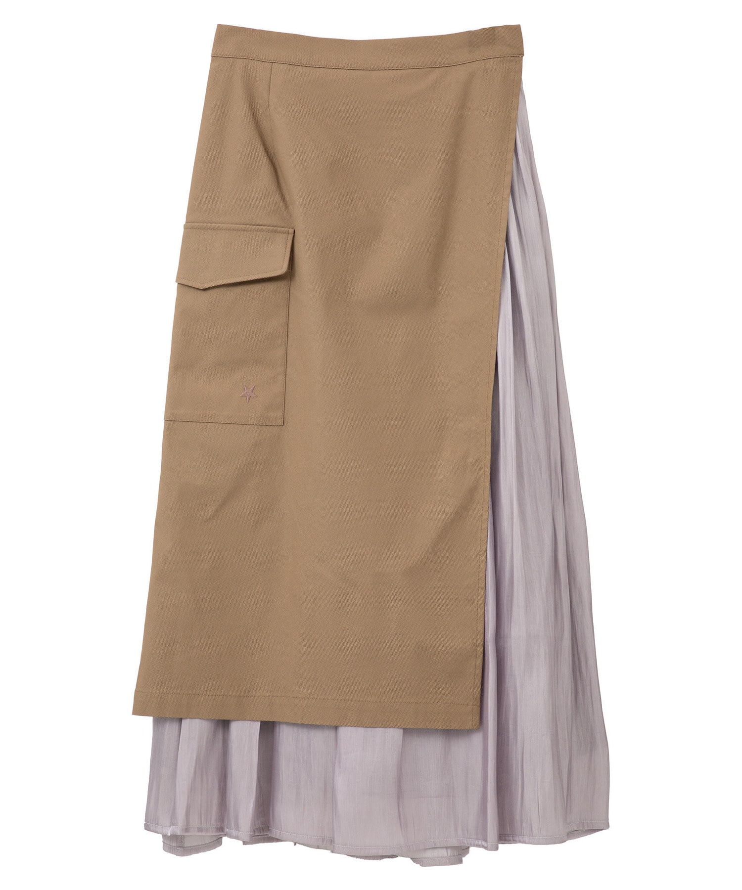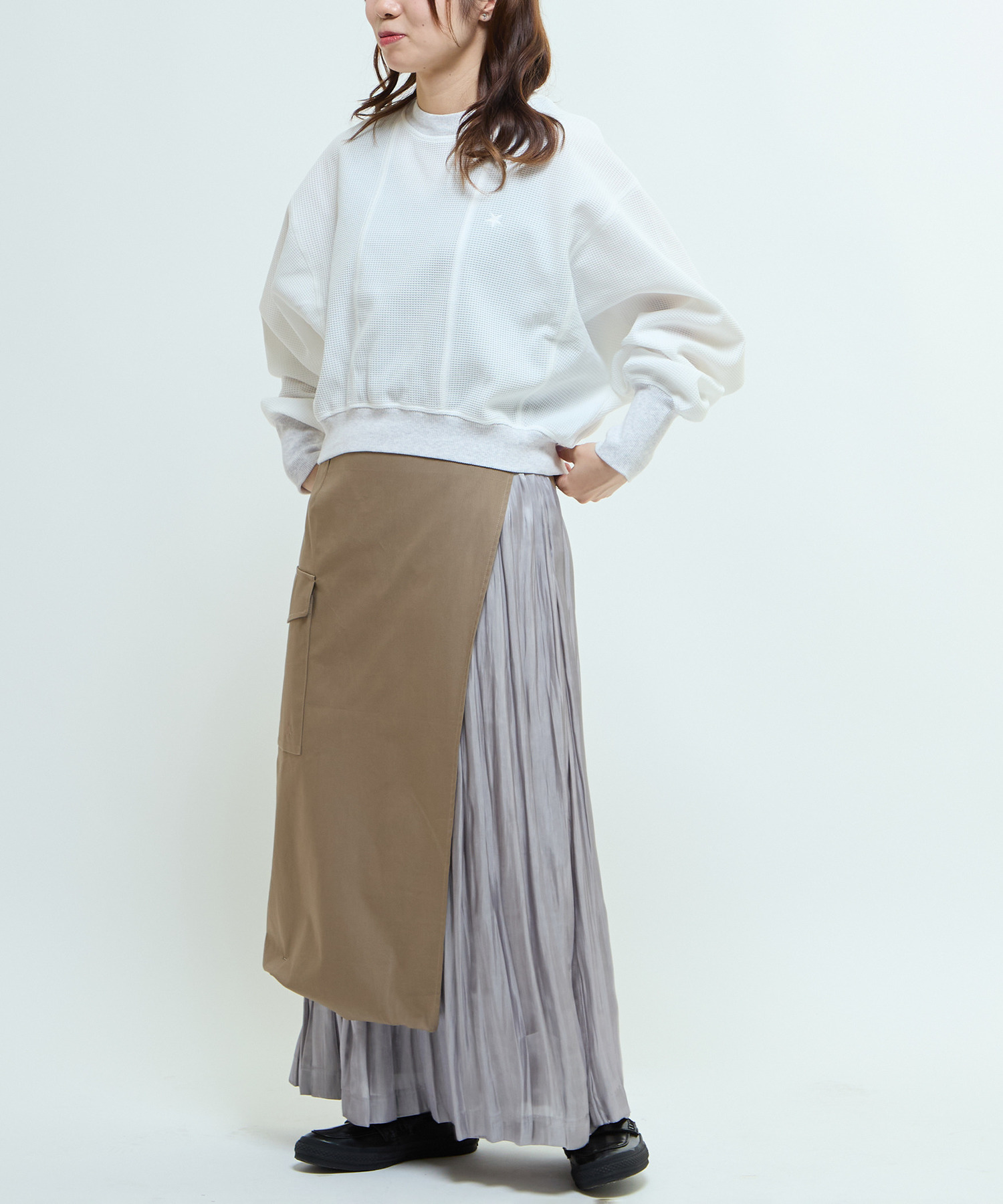 マットなツイル素材と、軽やかで光沢のある楊柳素材をレイヤードした異素材MIXスカート。