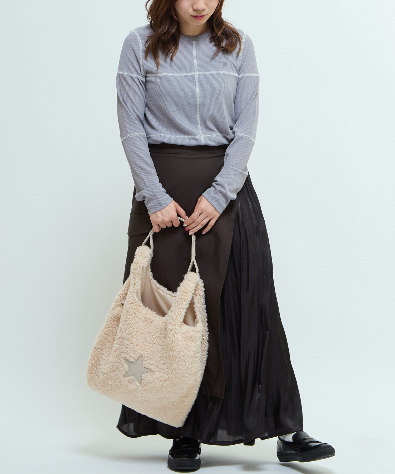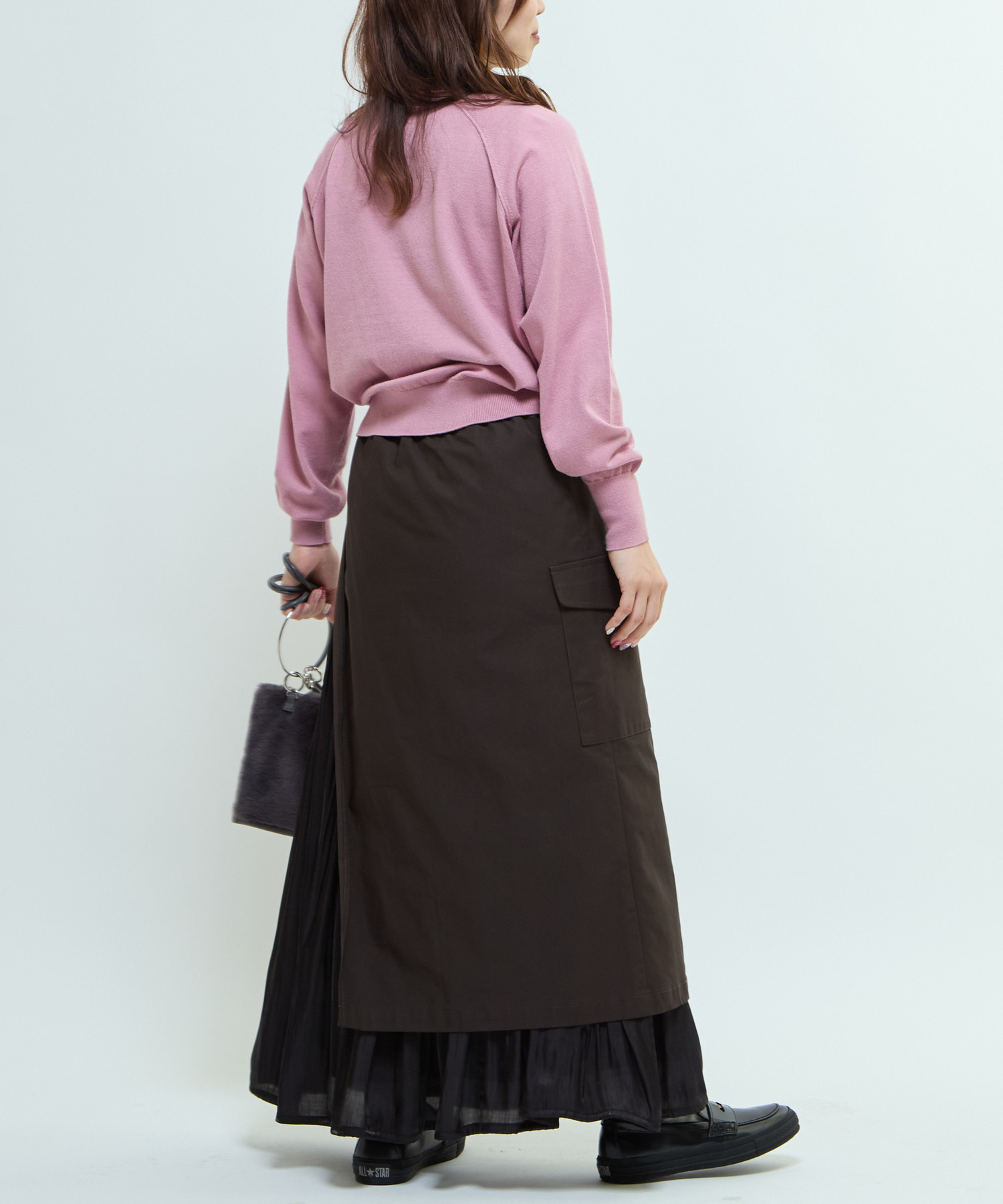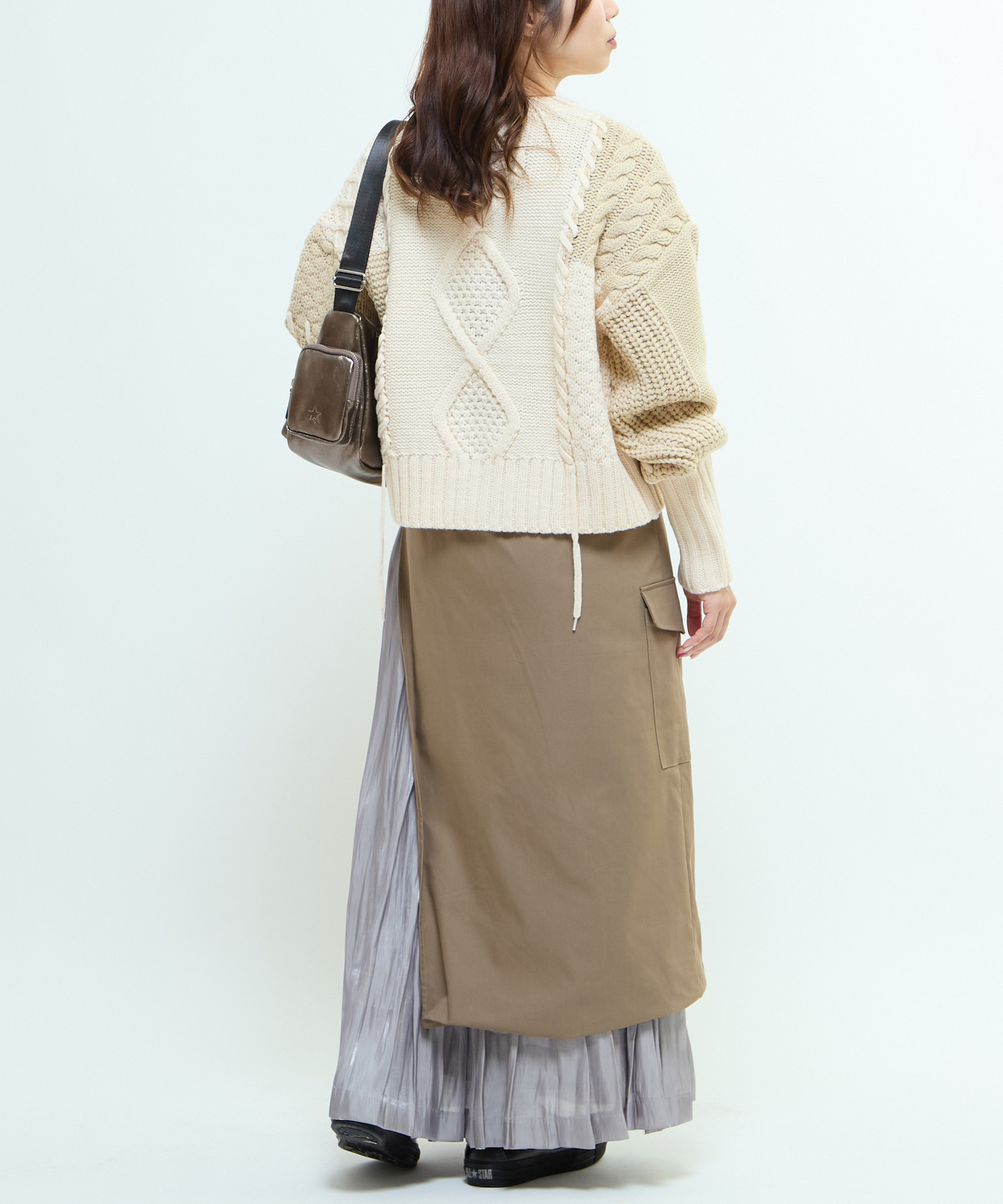 マットなツイル素材と、軽やかで光沢のある楊柳素材をレイヤードした異素材MIXスカート。