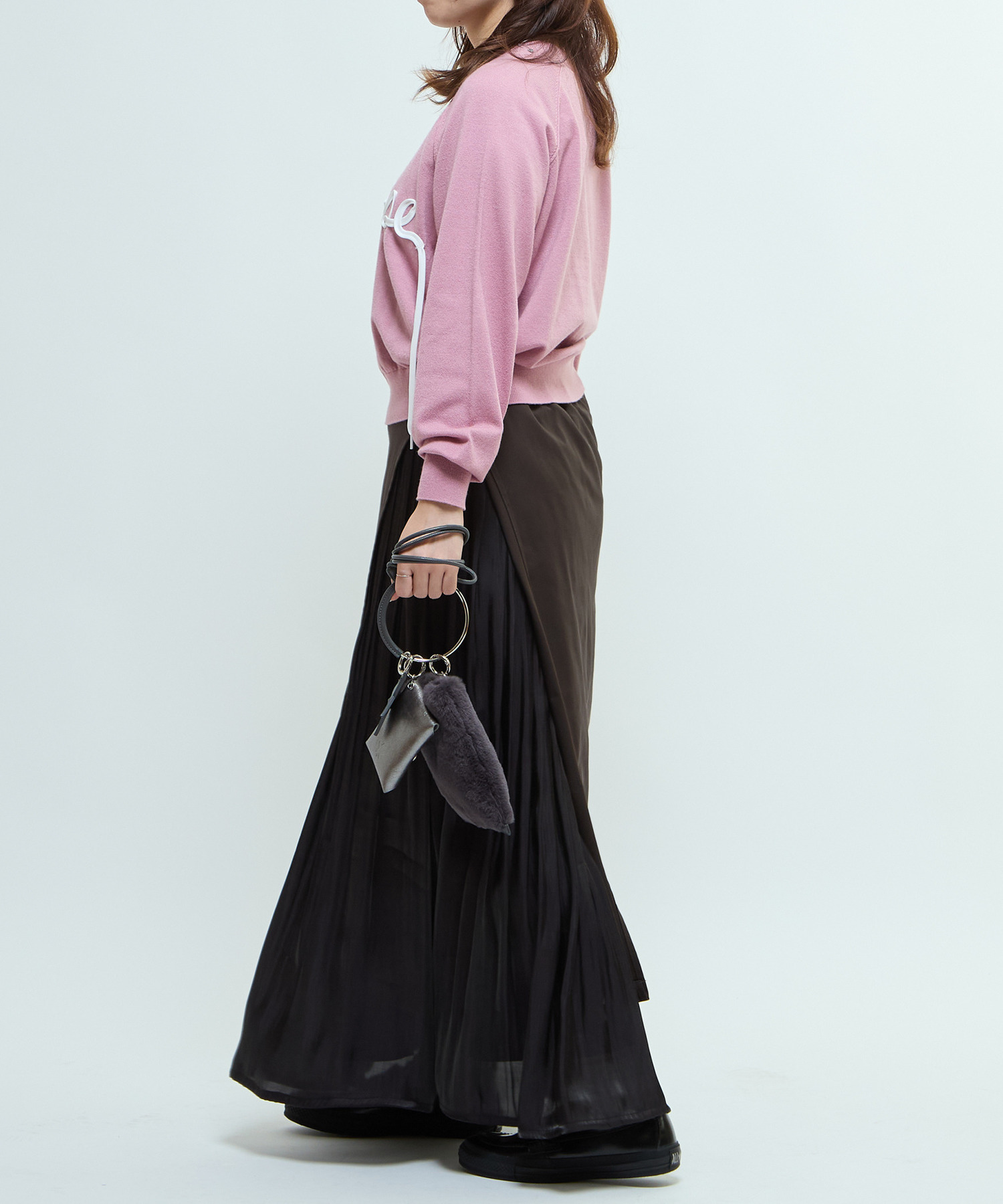 動くたびに表情を変える素材の掛け合わせが、女性らしい雰囲気を演出。