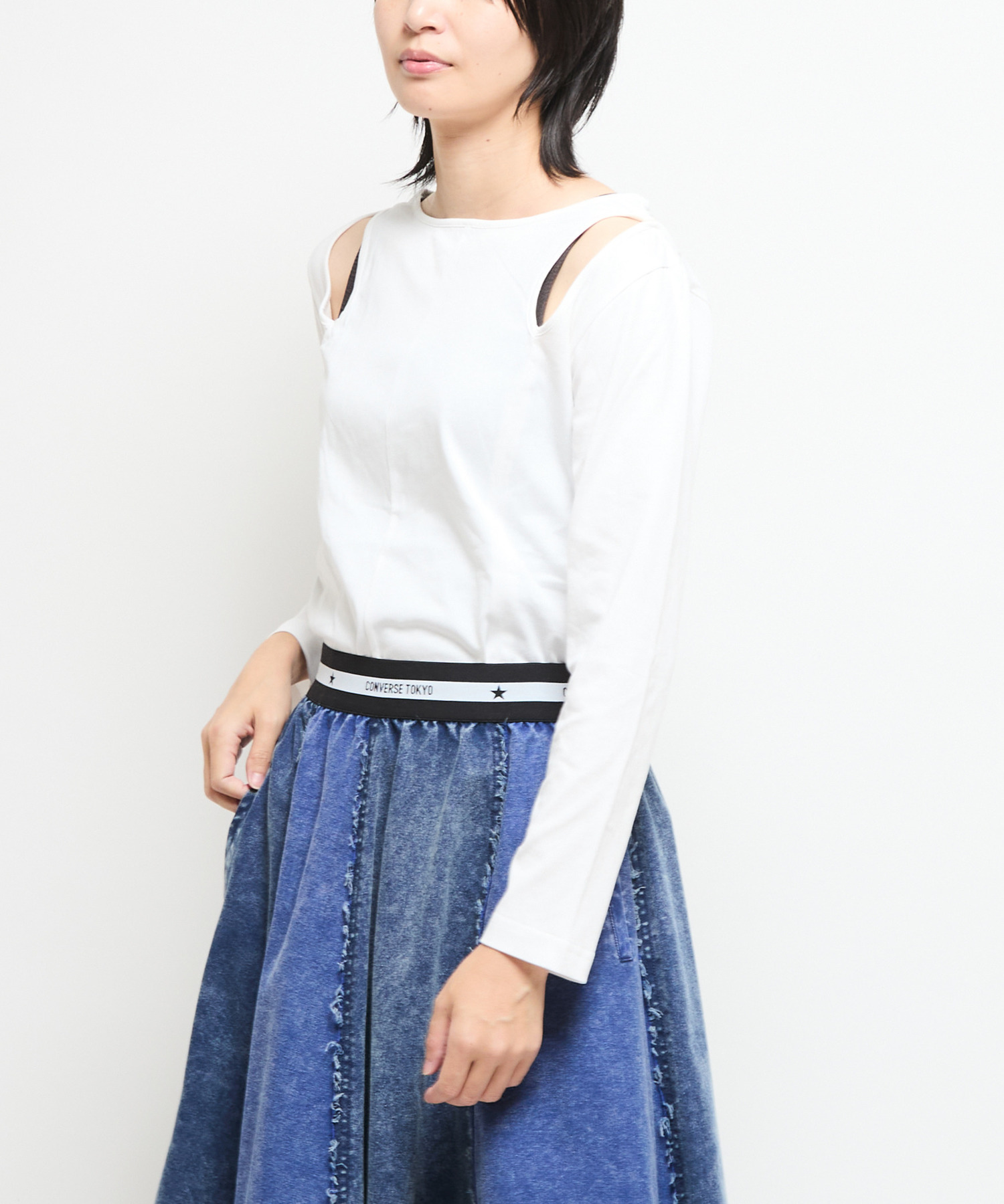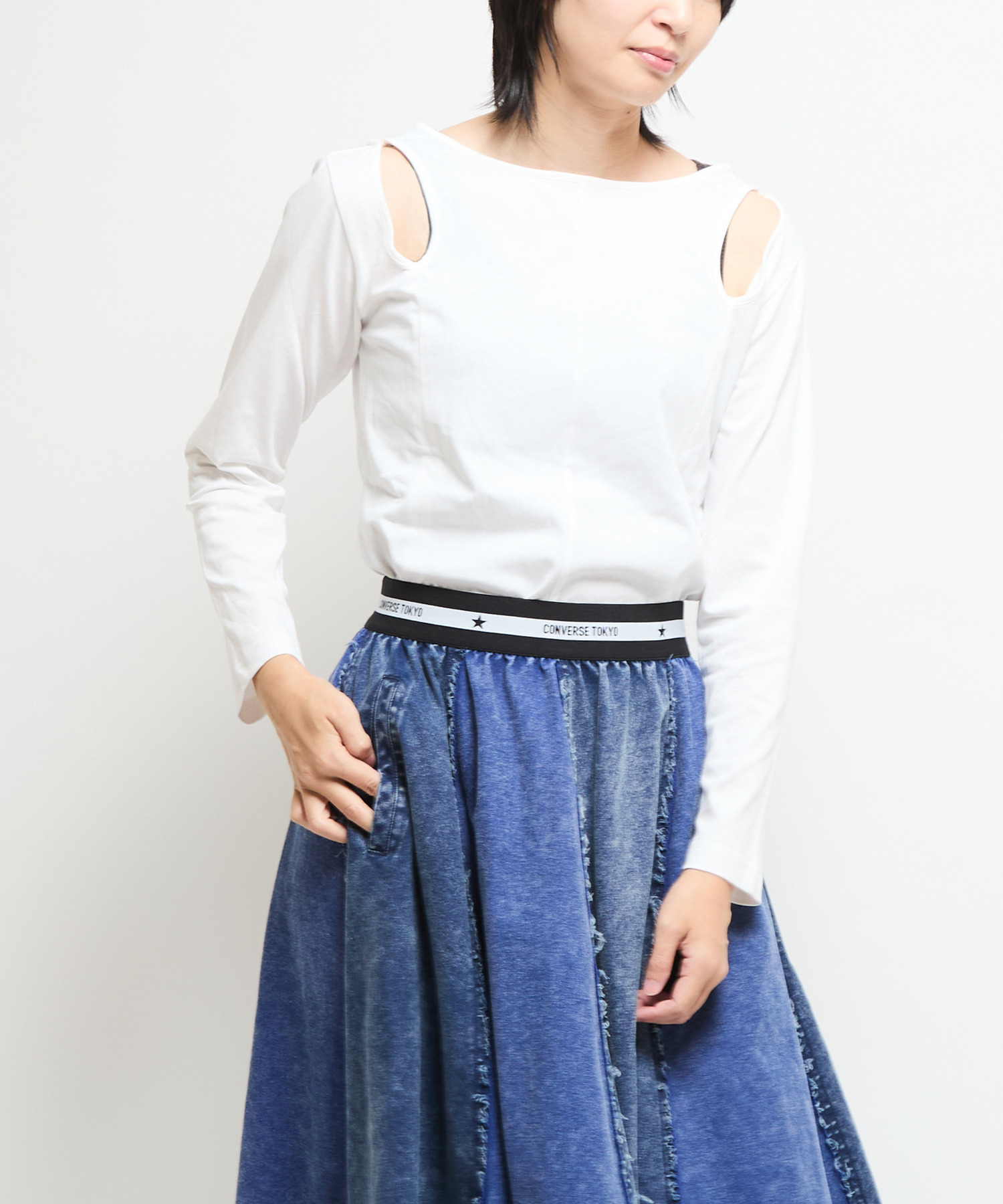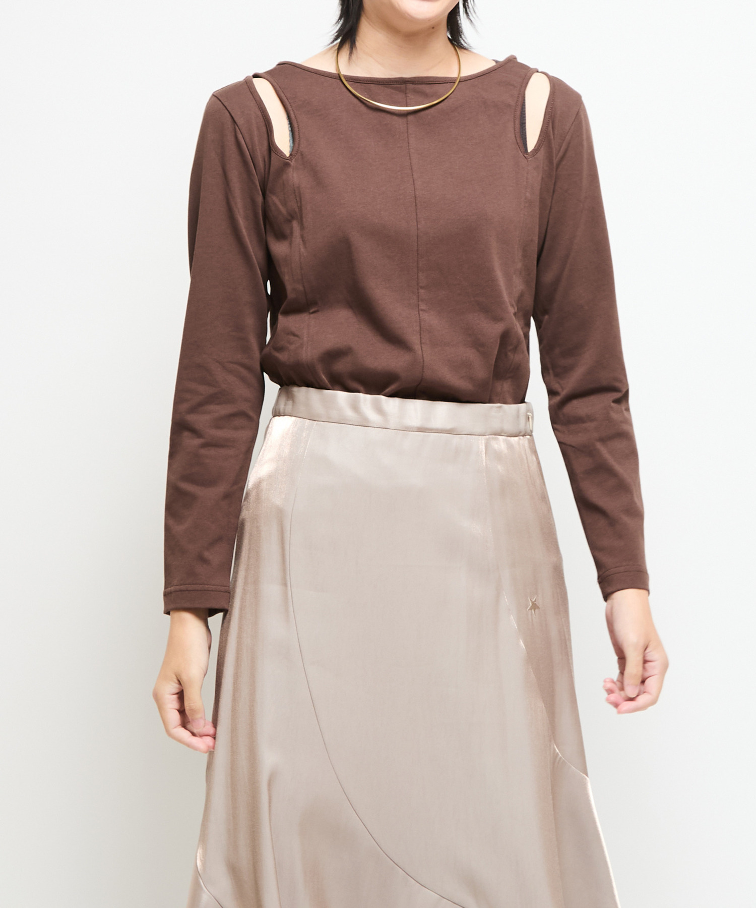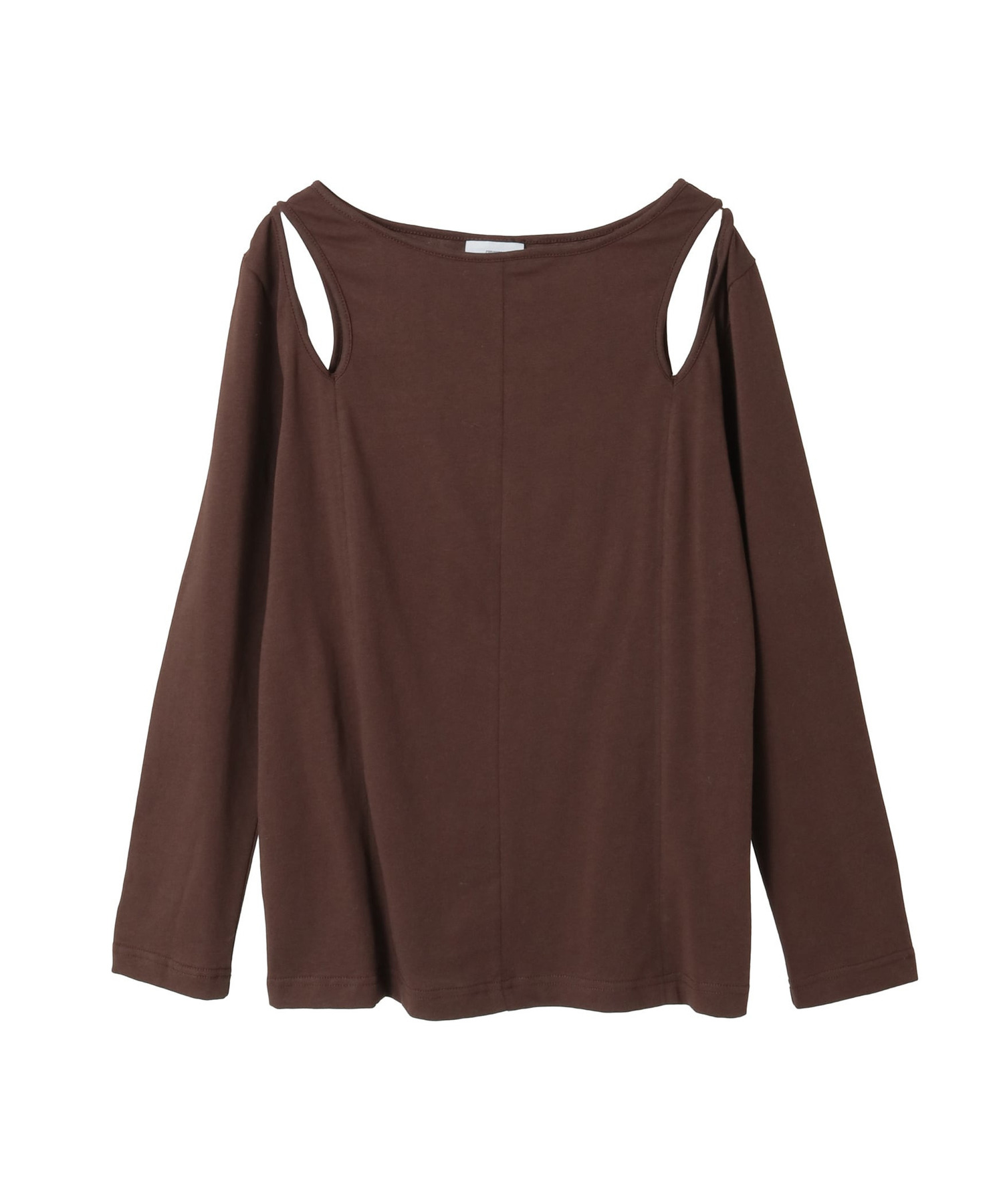 一枚でカジュアルからモードまで幅広く活躍する、肩部分にスリットを施したデザイントップス。