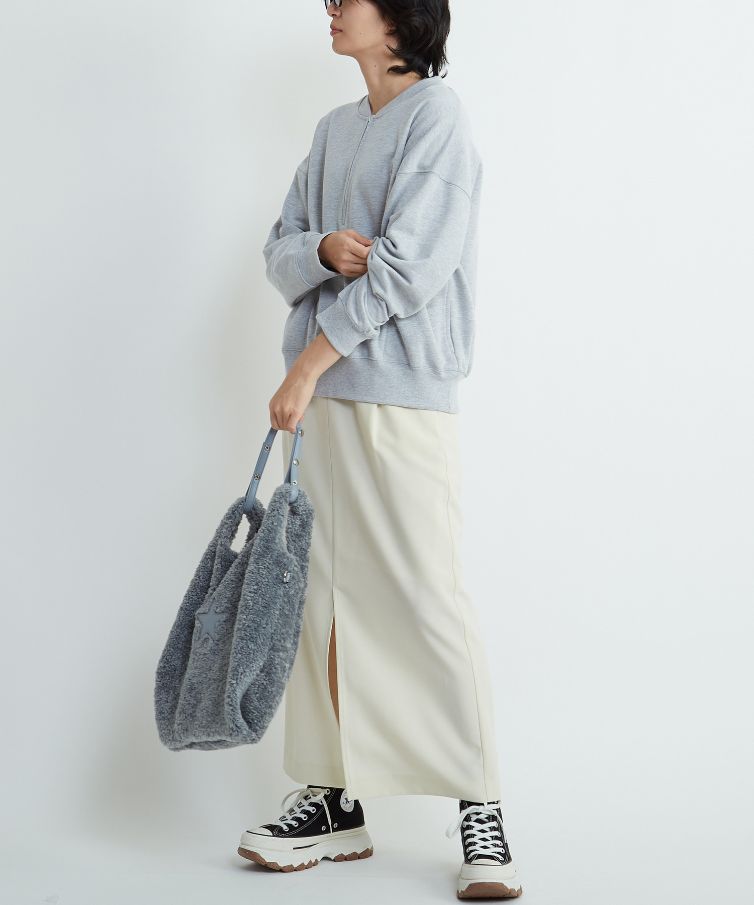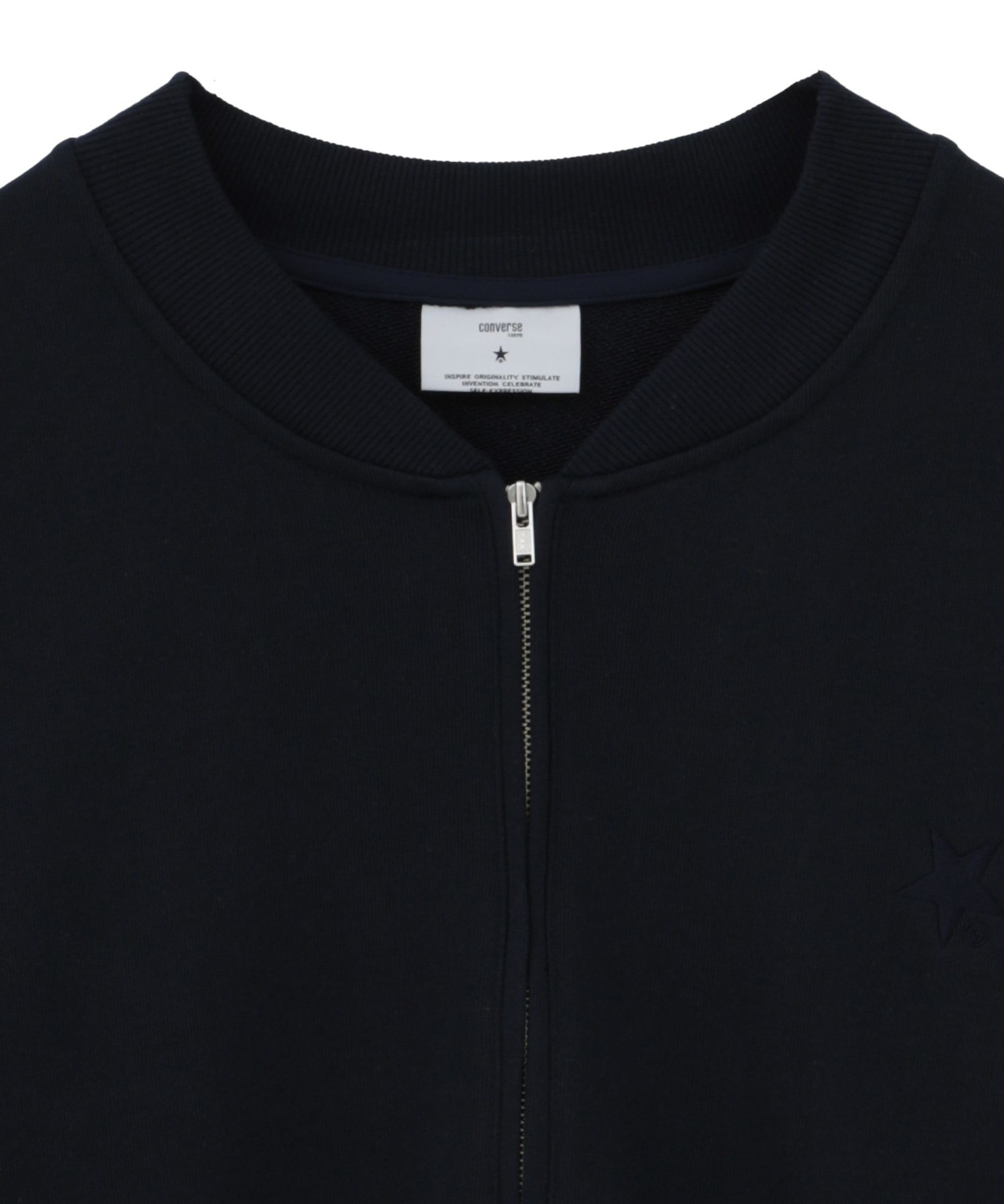 フロントのジップがアクセントになり、カジュアルながらもクリーンな印象に仕上げた一枚。