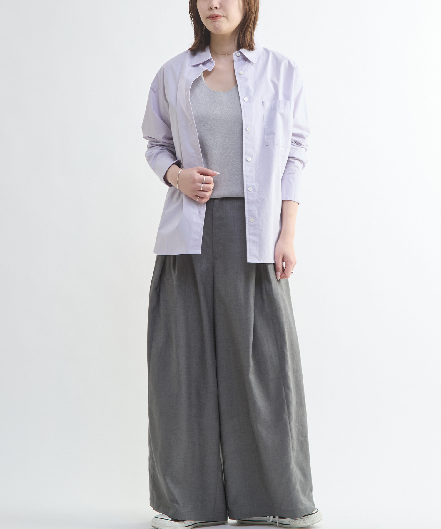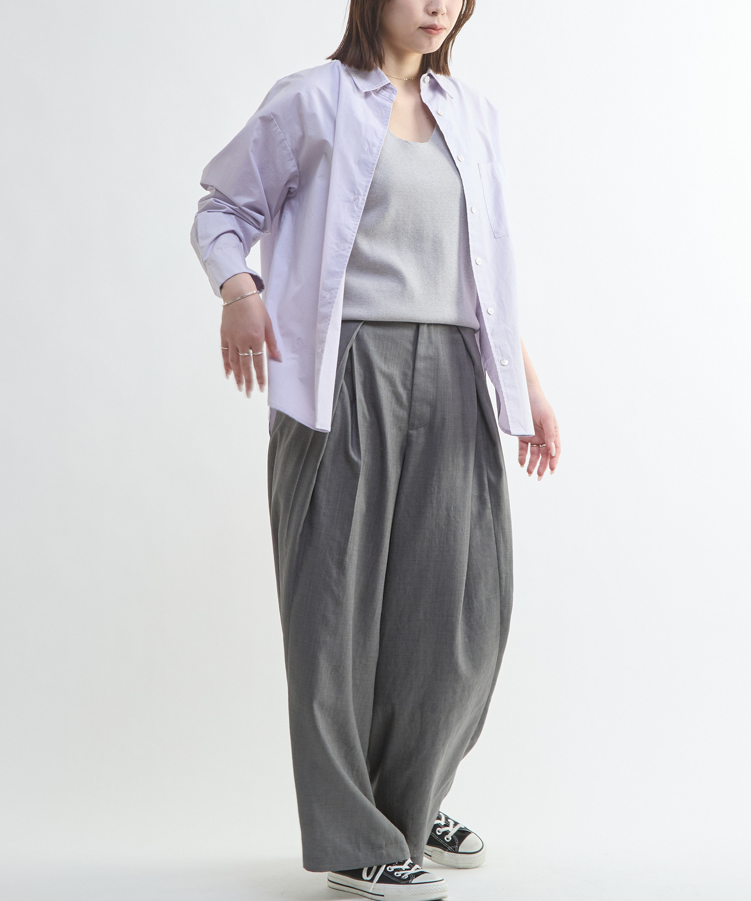 前身頃が少し短めなので、ワイドパンツと合わせても重たくならず、前だけインする着こなしも◎。