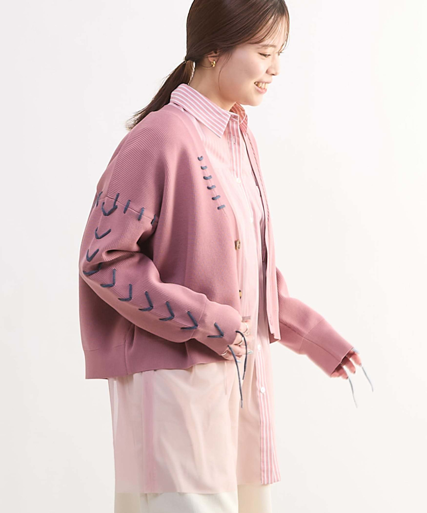 内側のシャツはやや短丈ながらも、お腹周りをさりげなくカバーしてくれるデザインで、1枚でレイヤードスタイルが完成するのもポイント。