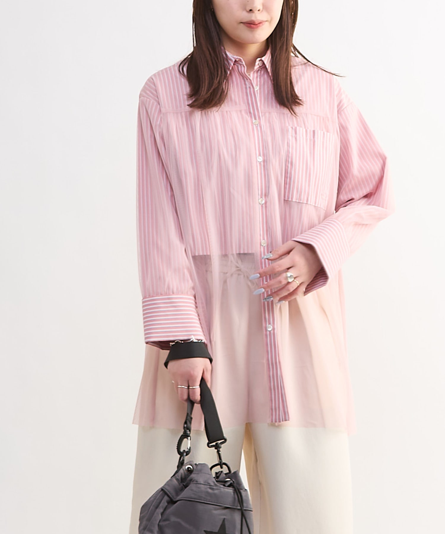 柔らかく透け感のある質感がスタイリングに華やかさを添え、シーズンレスで着用可能。