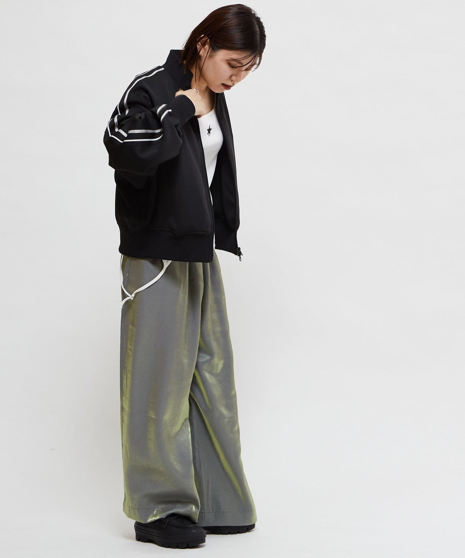 サイドの編立リブに”ALLSTAR”のラインをデザインに落とし込み、ラメ素材を使用することでよりトレンドライクな印象に仕上げたトラックジャケット。