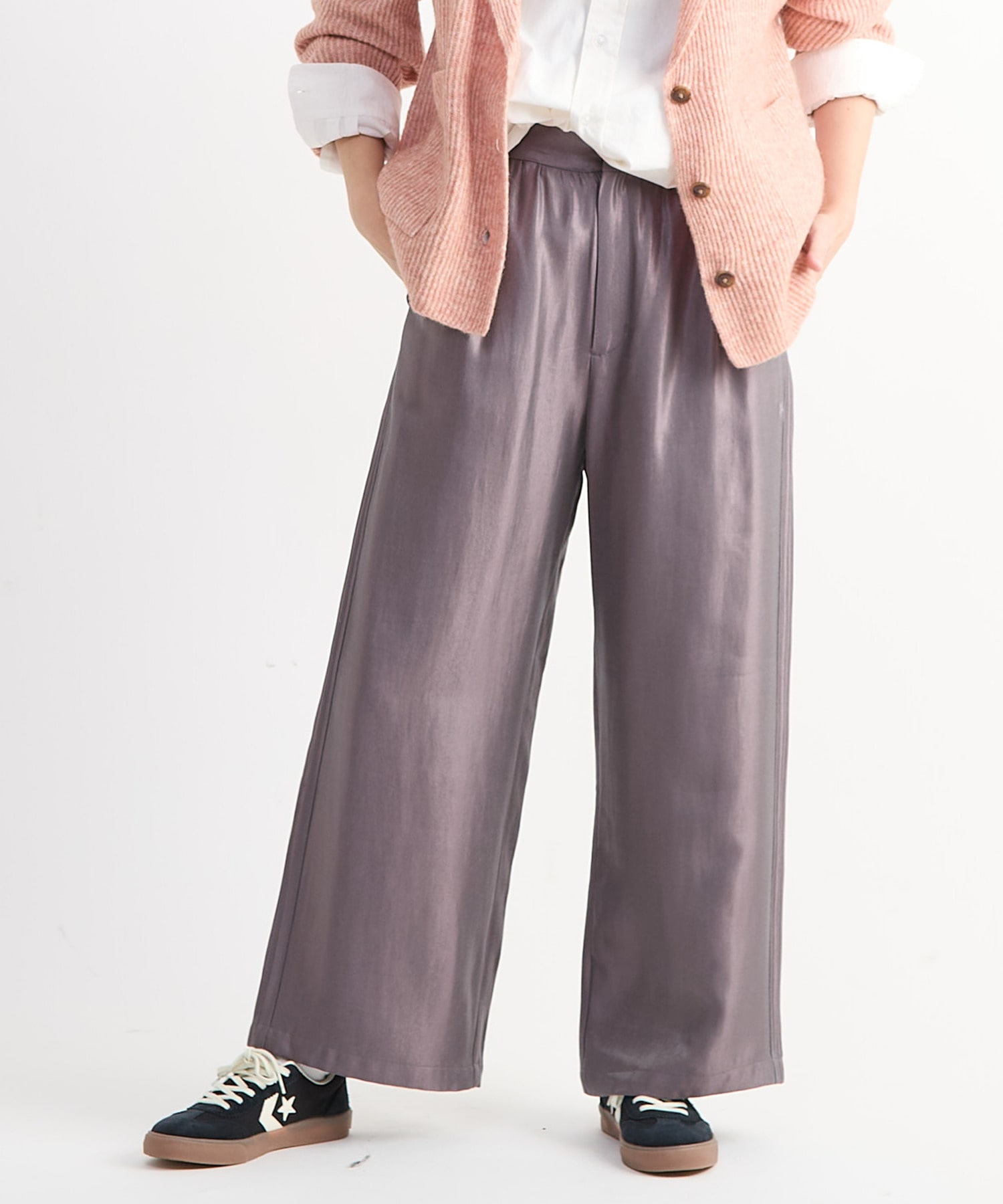 シャイニーサテンピンタックワイドパンツ