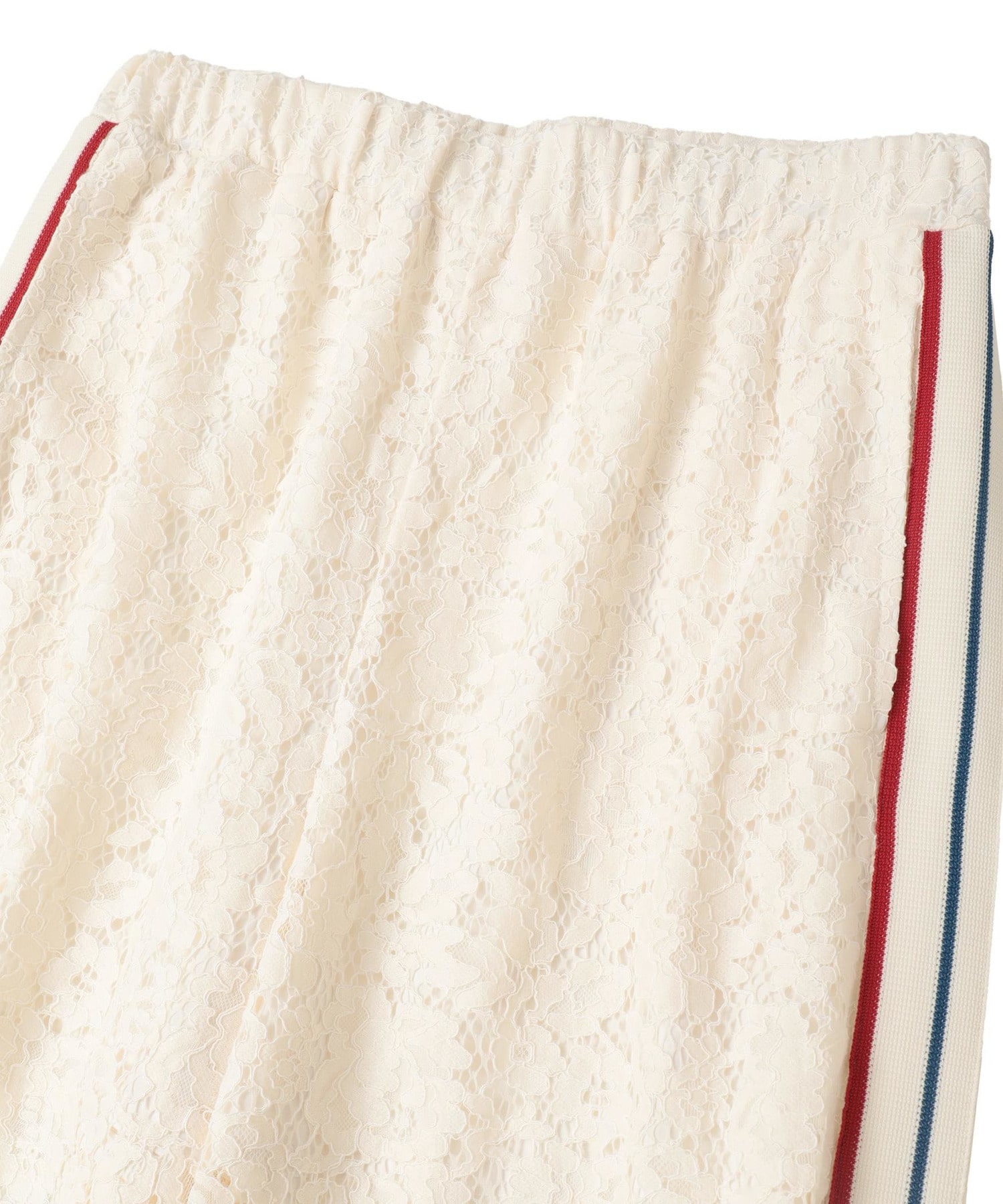 トラックパンツのカジュアルな要素と、レースの女性らしさを掛け合わせた、ミックス感のあるデザインが魅力。