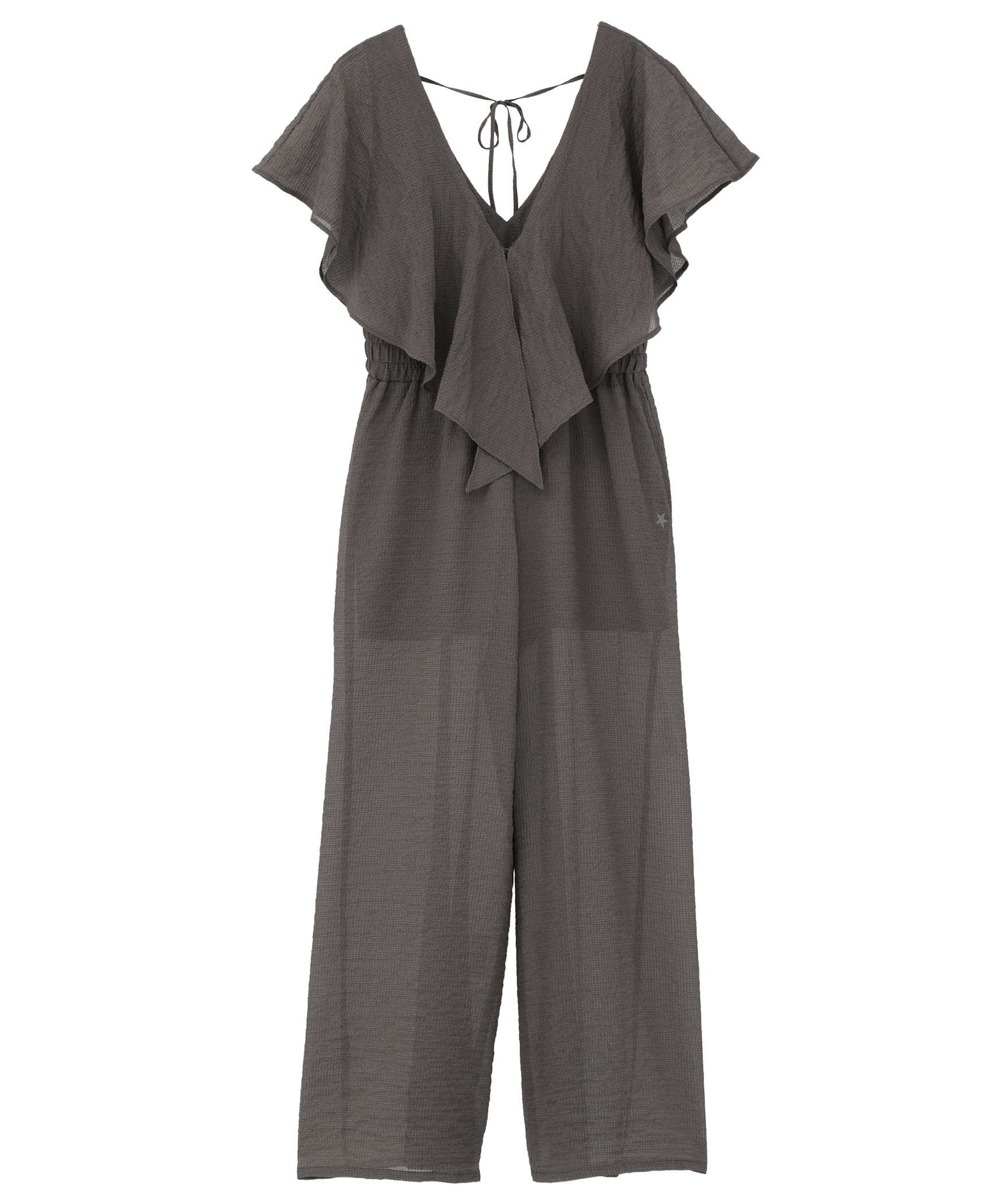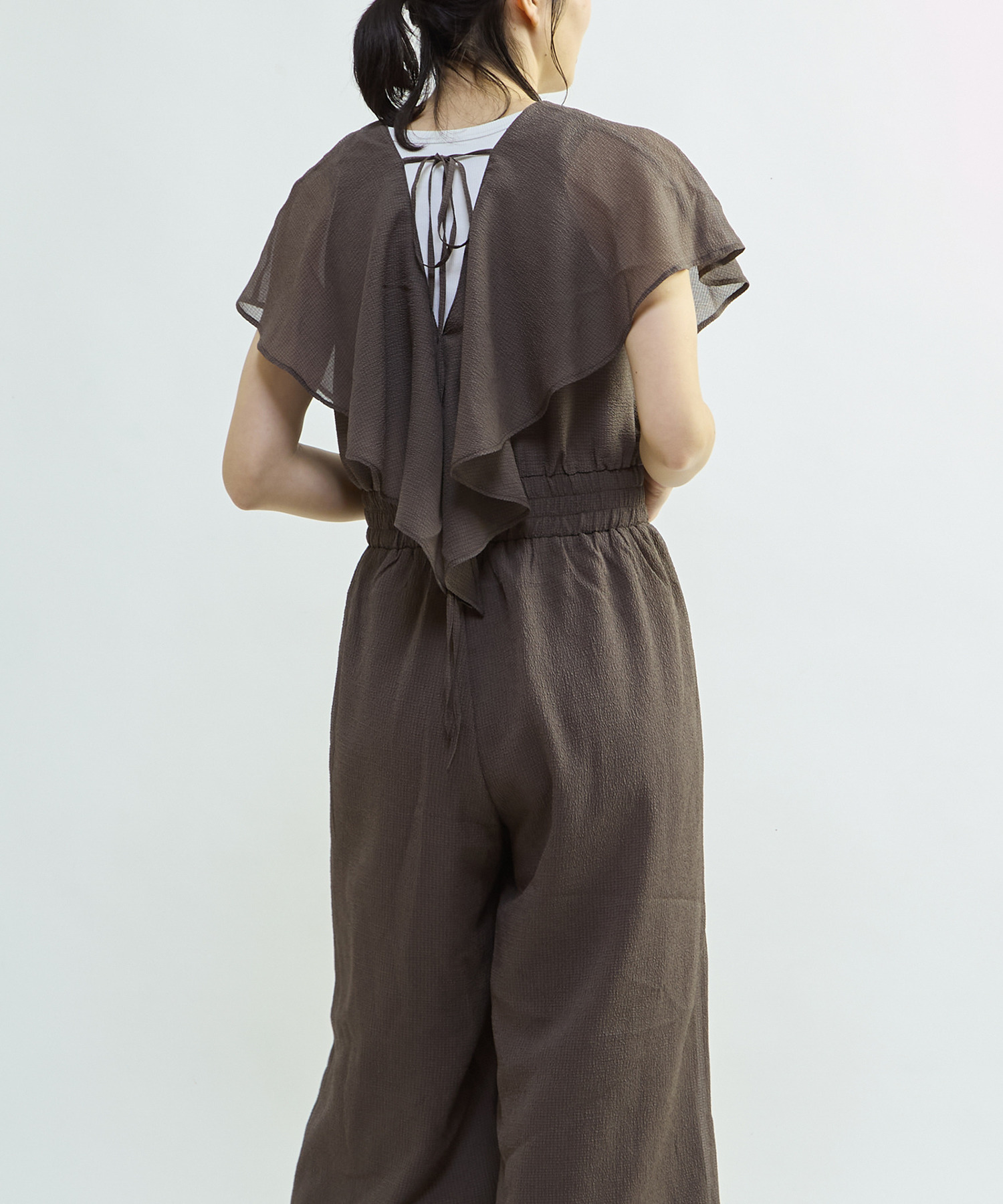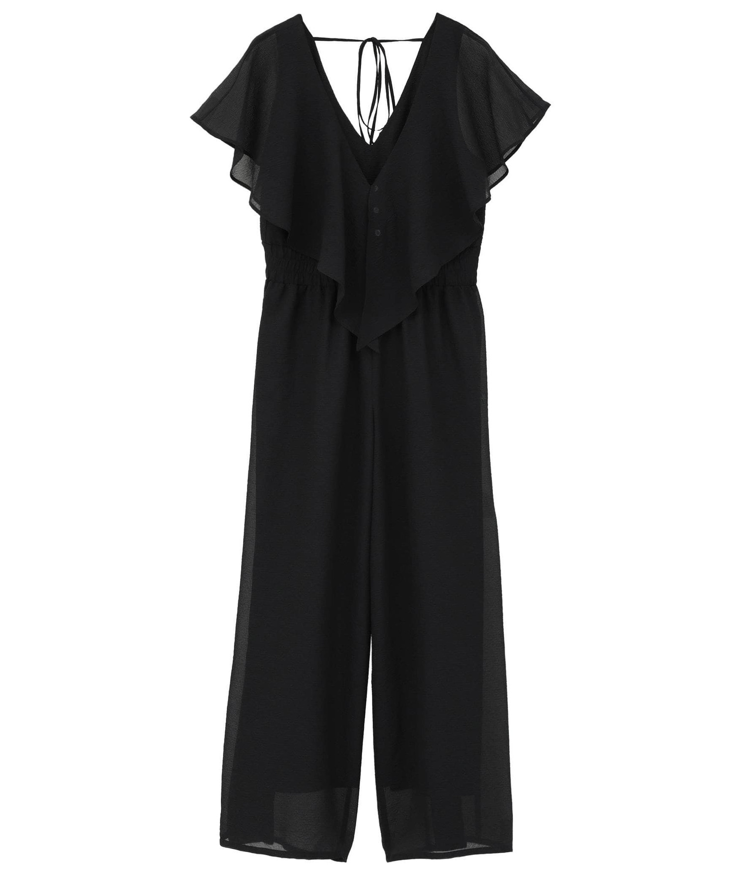 ボリューム感のあるフリルと深めに開いたVネックが、華やかさと涼やかさを演出するオールインワン。