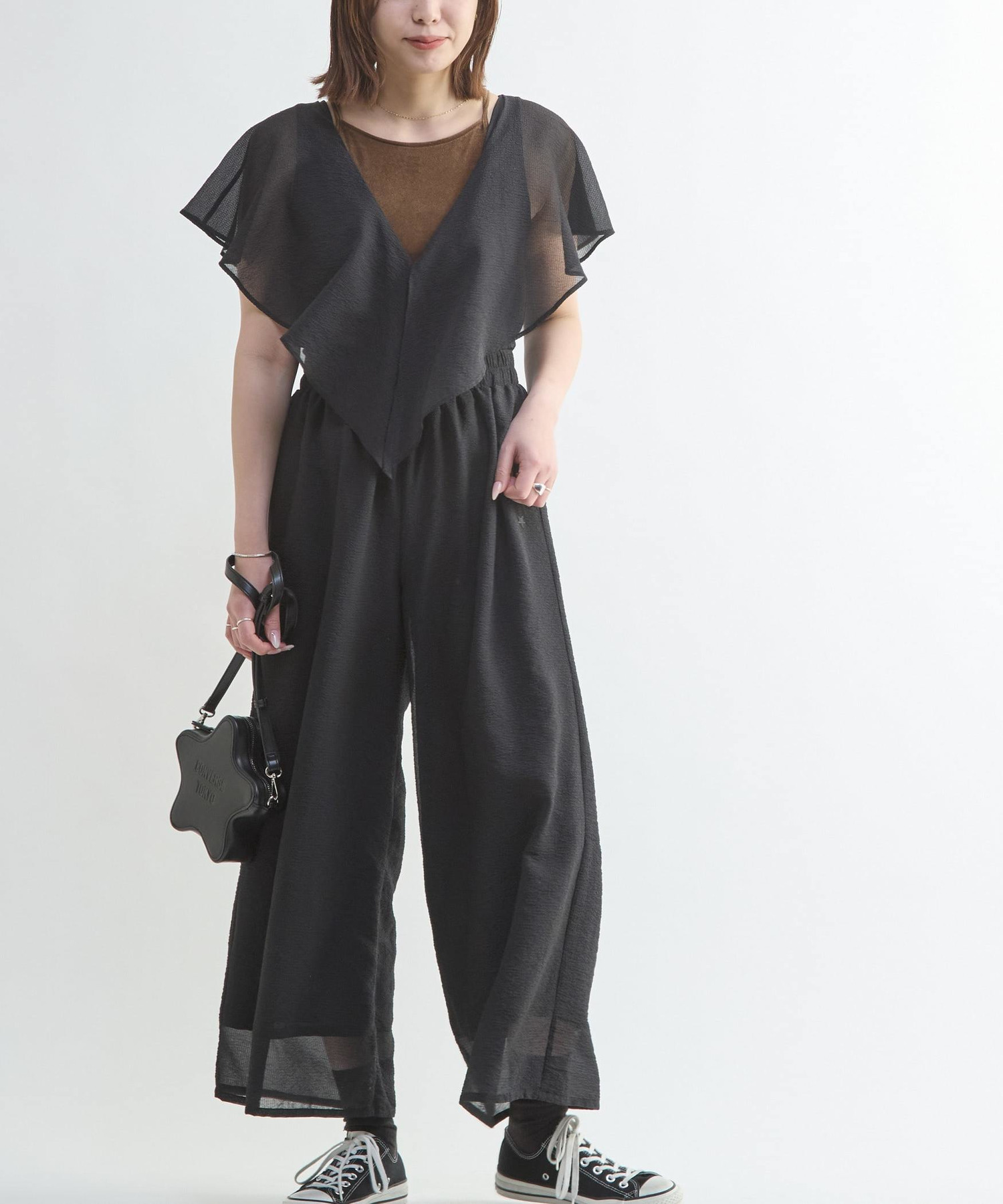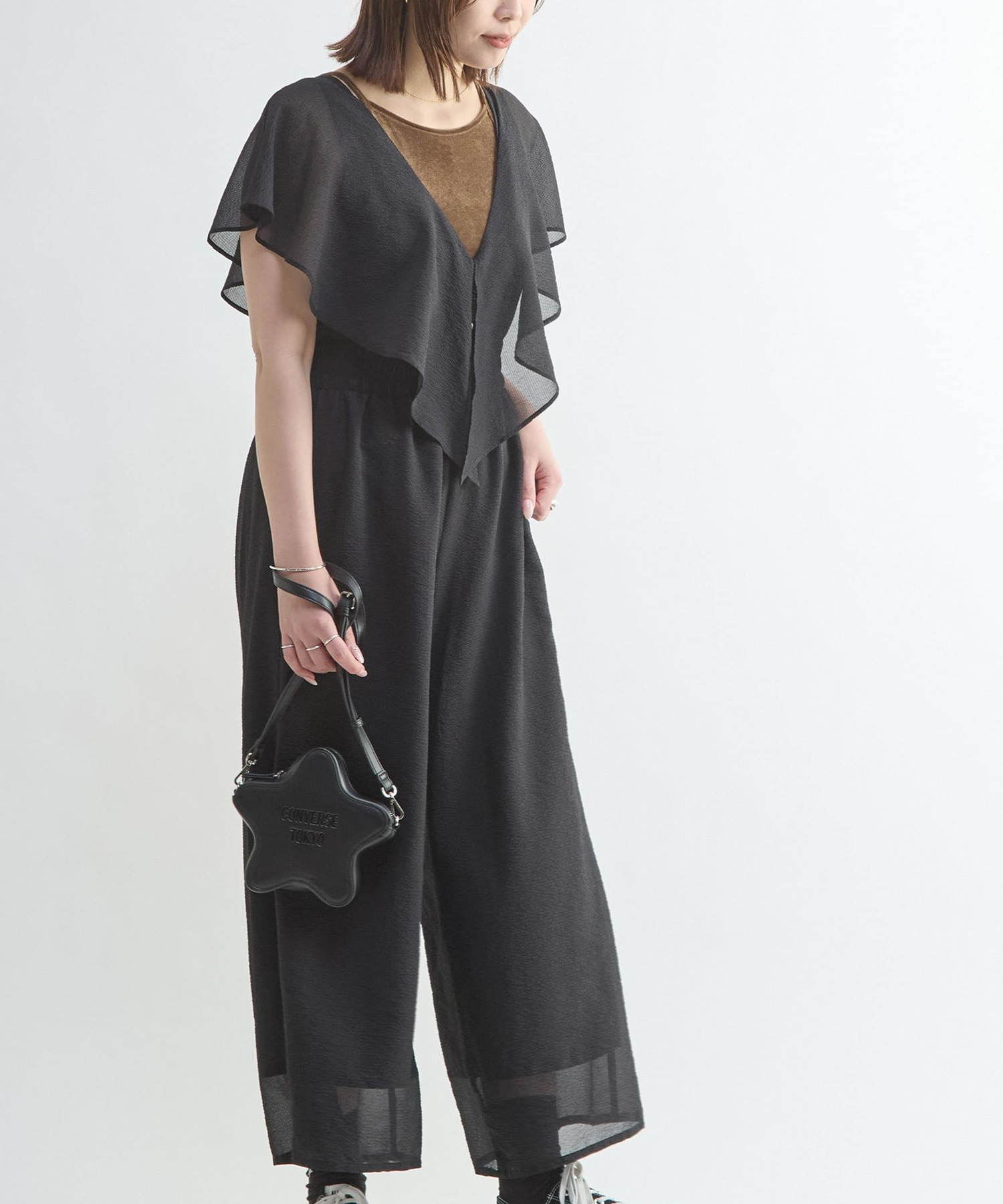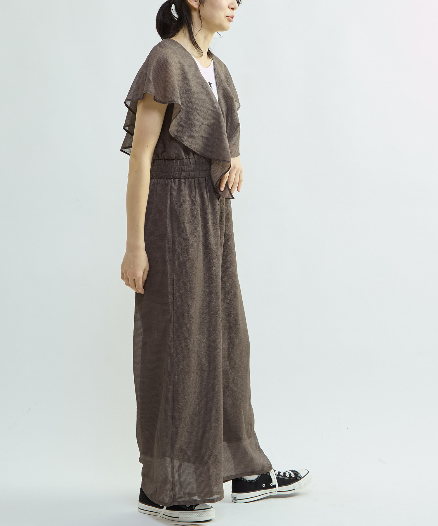 ボリューム感のあるフリルと深めに開いたVネックが、華やかさと涼やかさを演出するオールインワン。