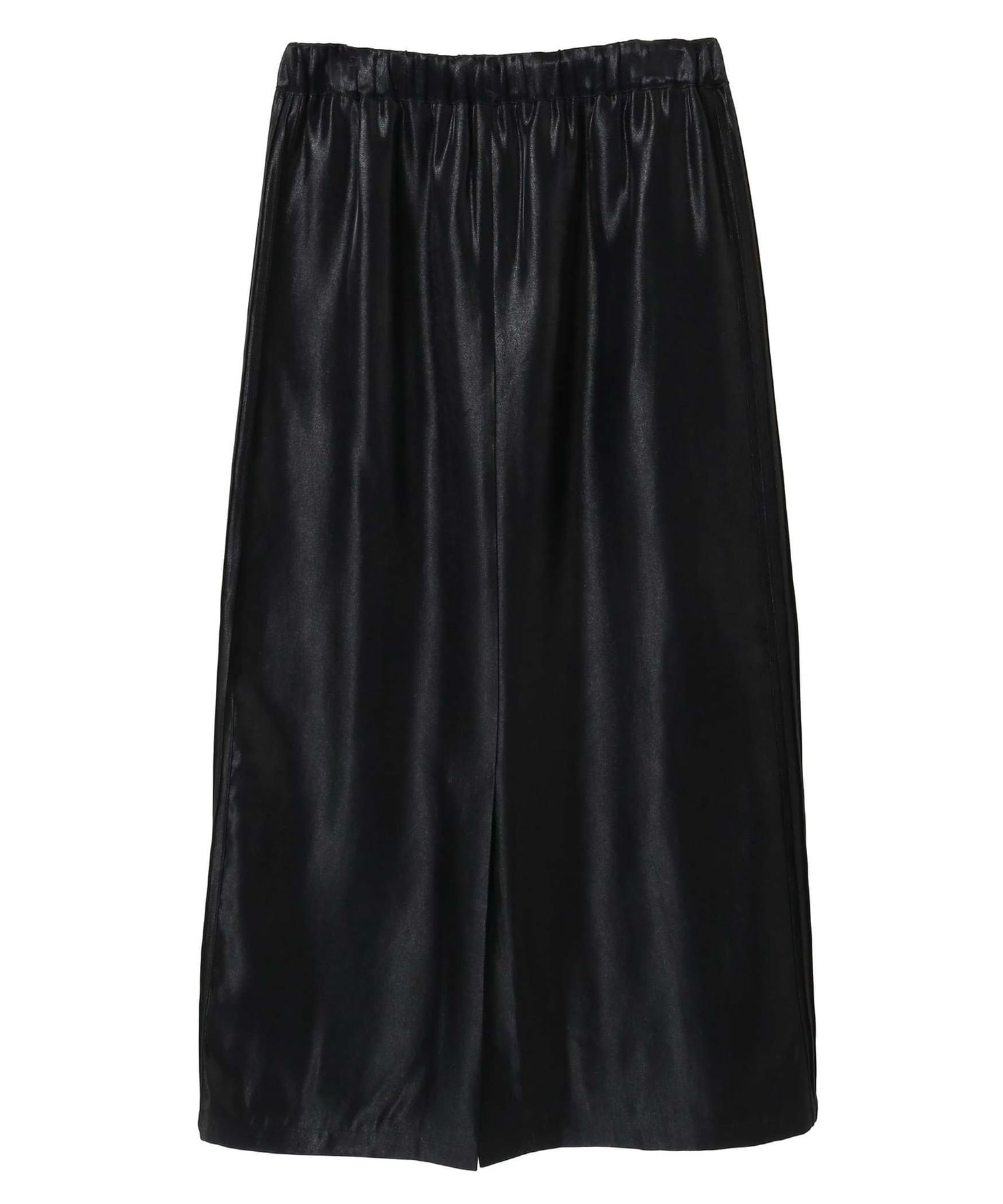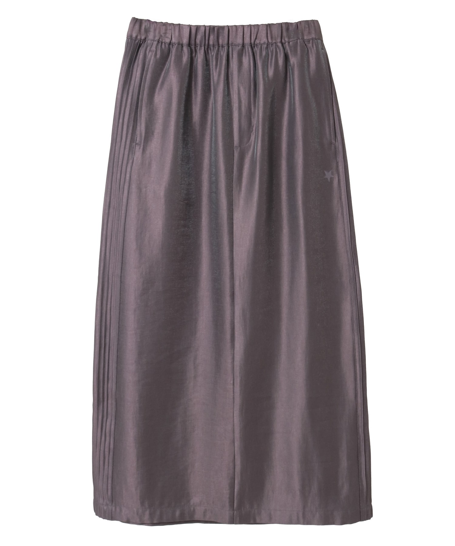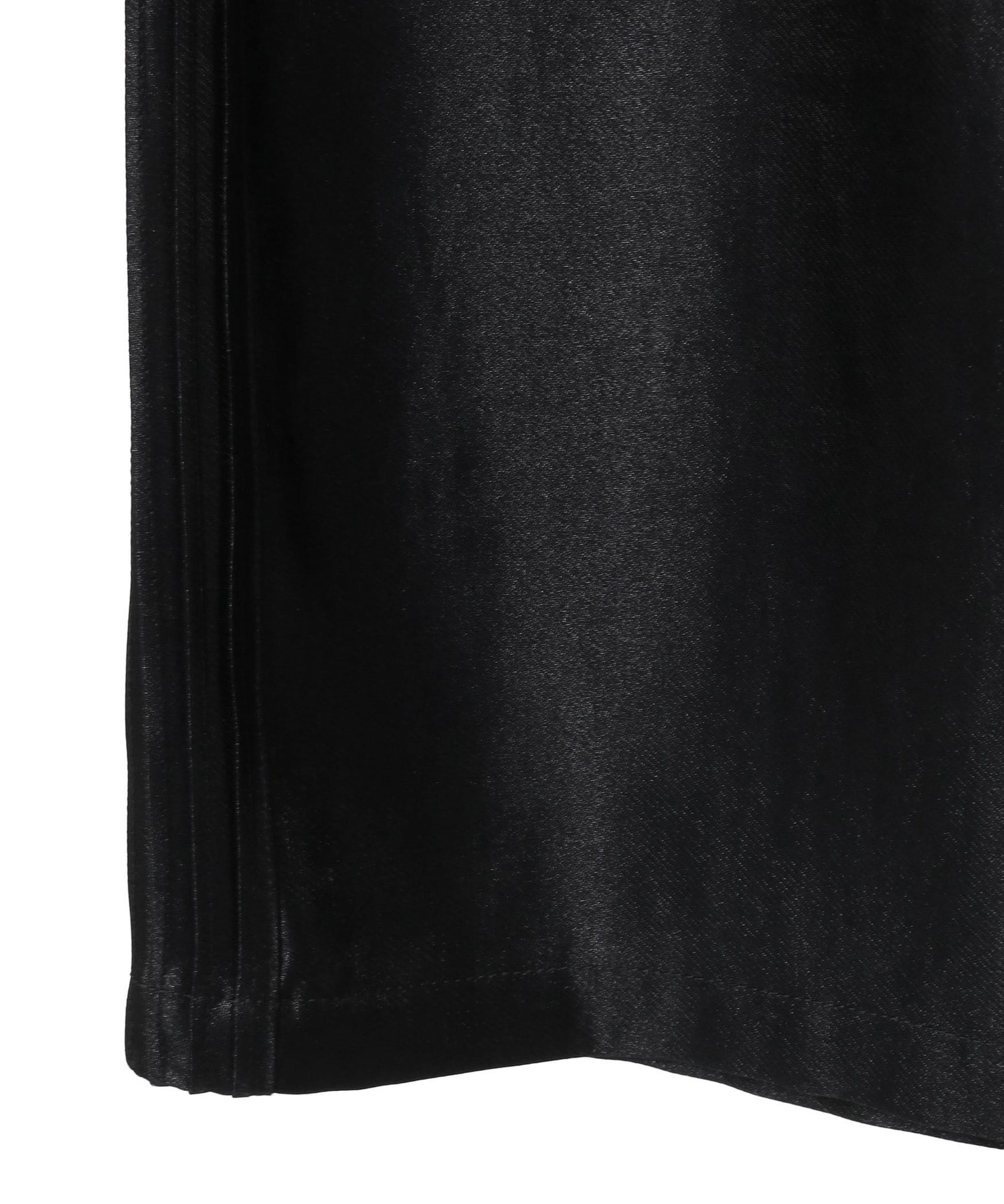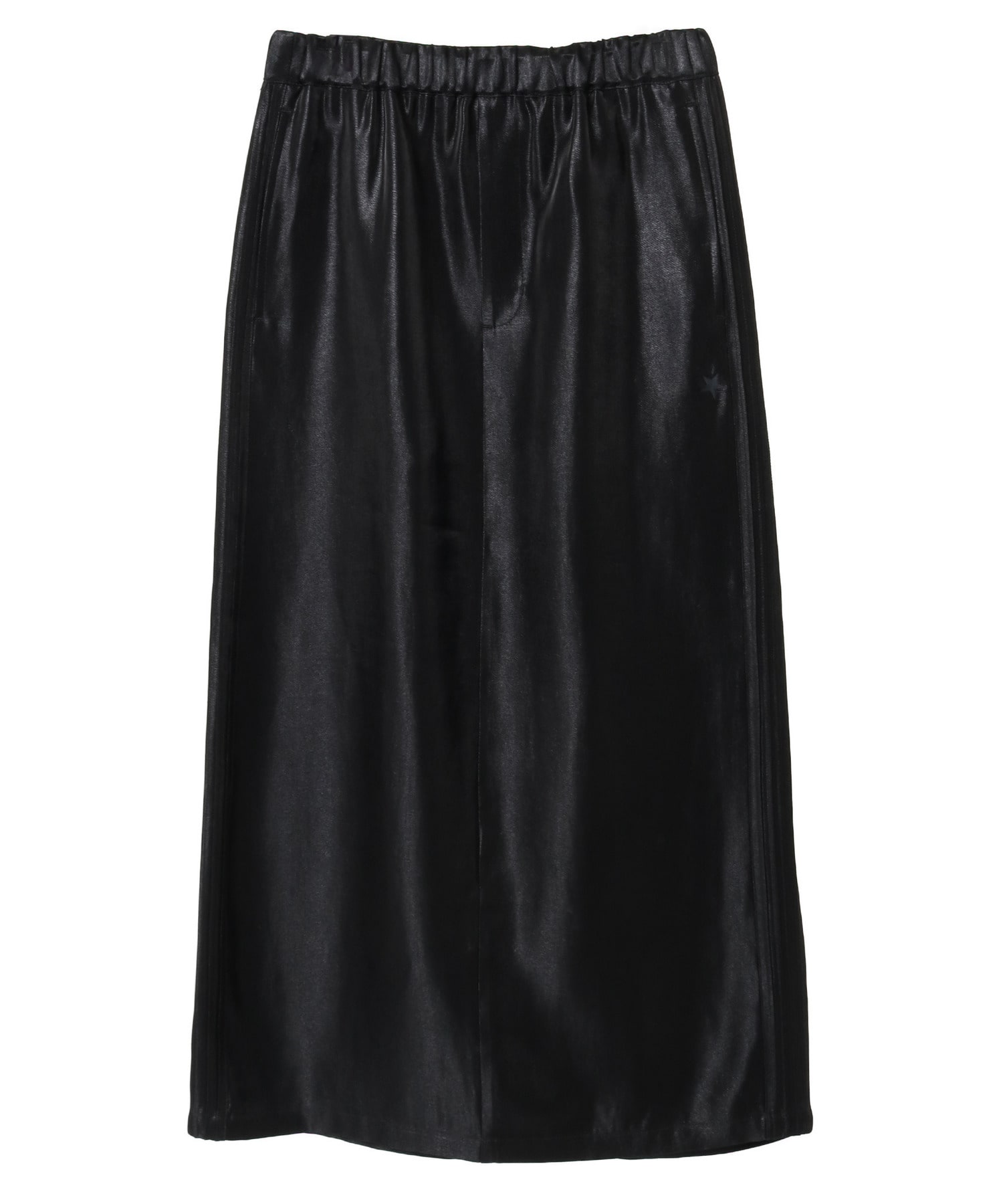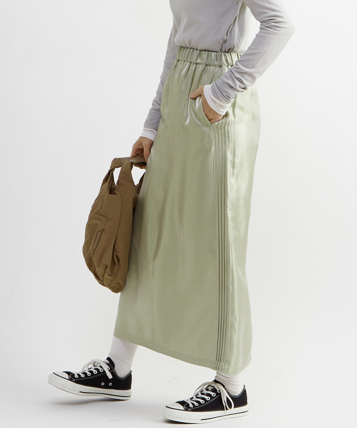 デザイン:両サイドにピンタックを入れサイドライン風に見せたスポーティーさのあるナロースカート。目を惹くシャイニー素材はコーディネートのアクセントになります。