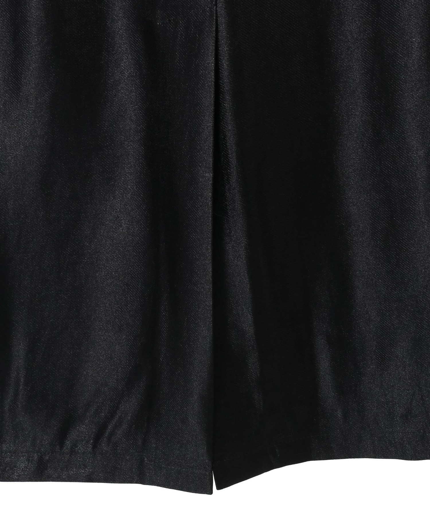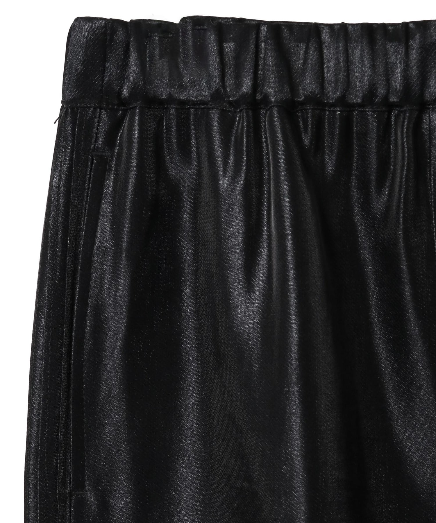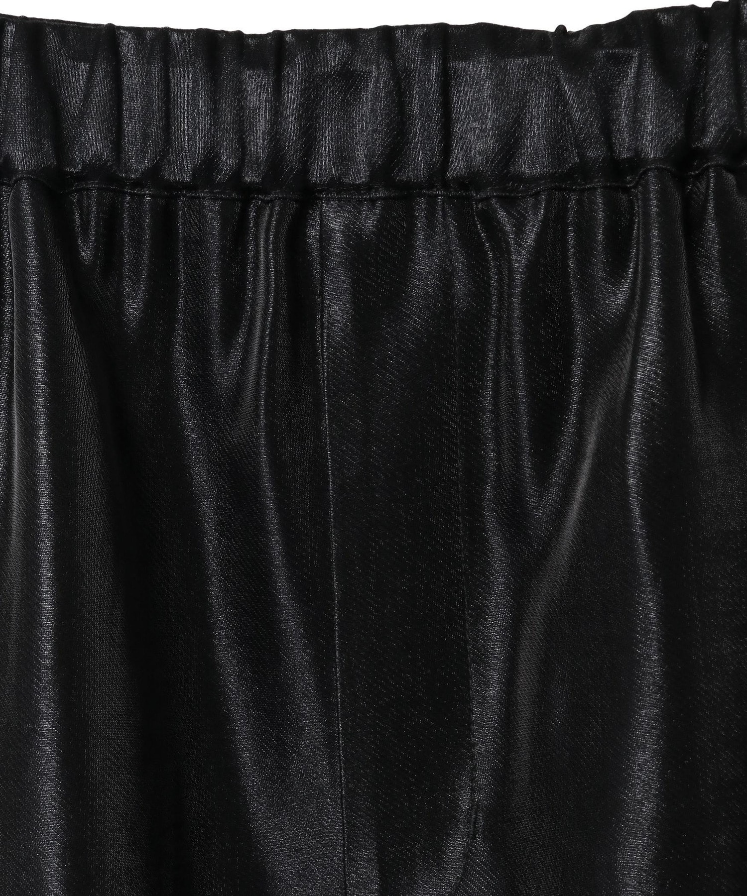 すっきりとしたシルエットながら、シャイニー素材の光沢感がコーディネートのアクセントに。