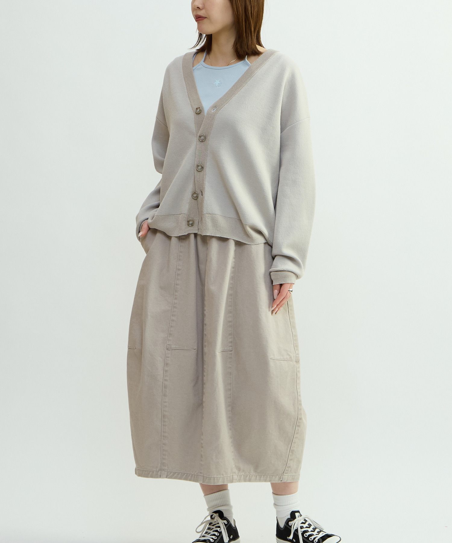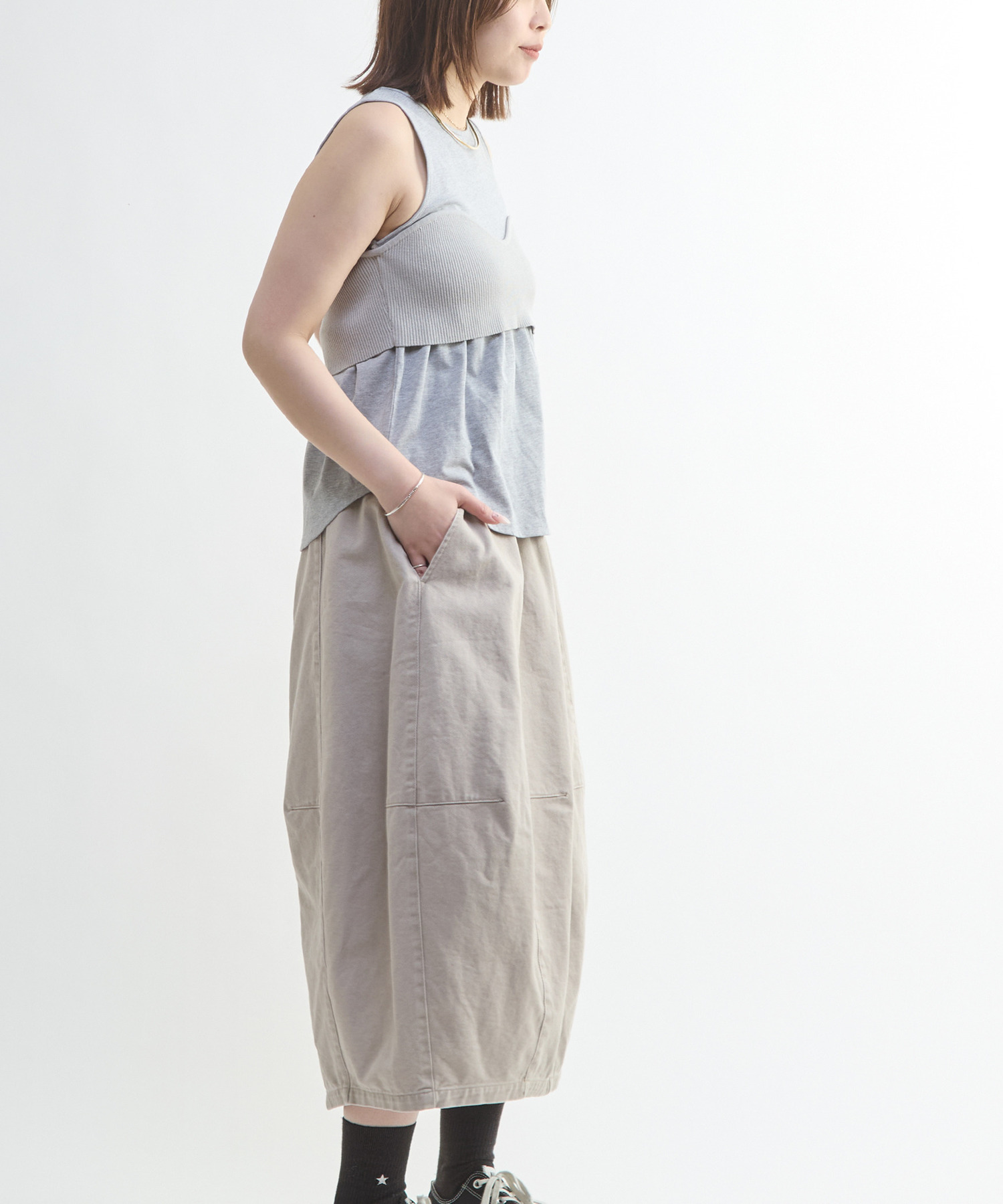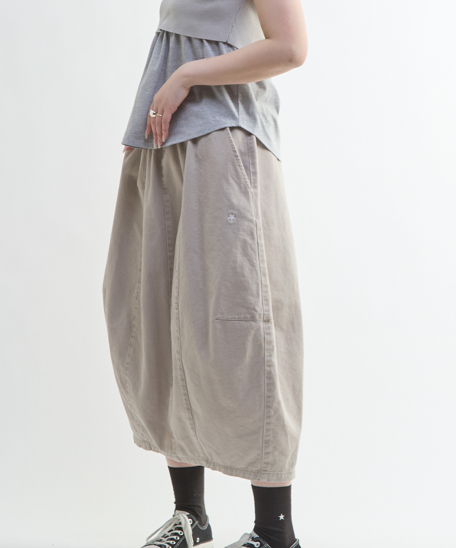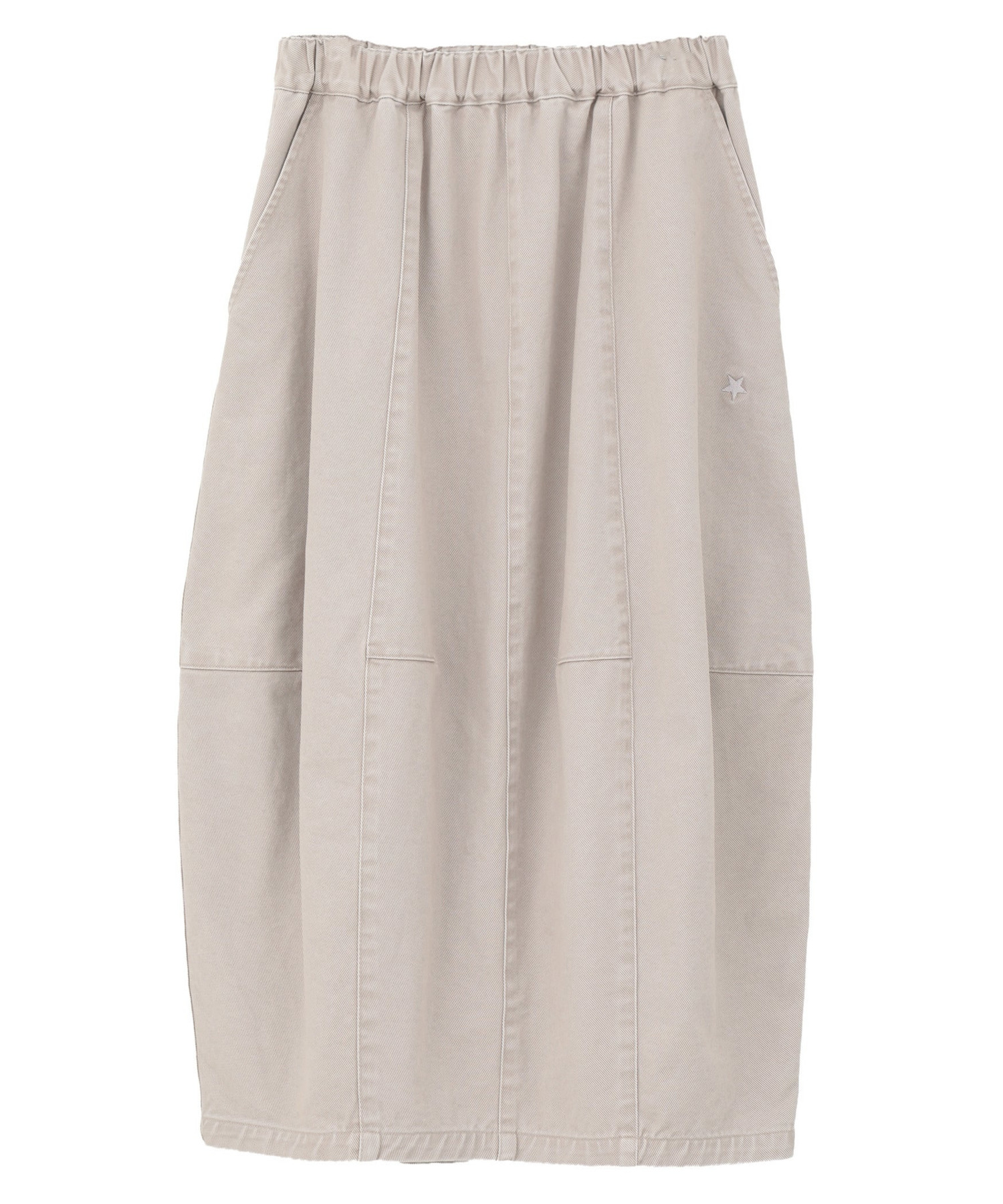 立体的なバレルシルエットが目を惹くスカート。