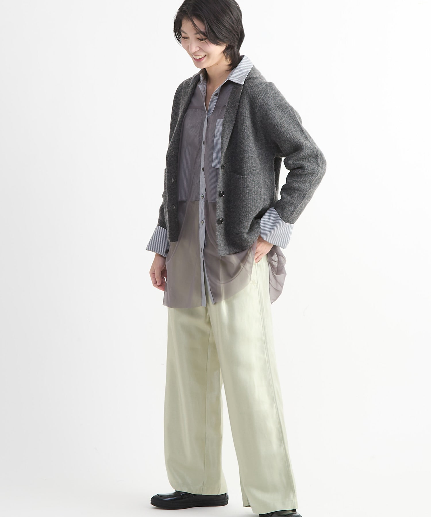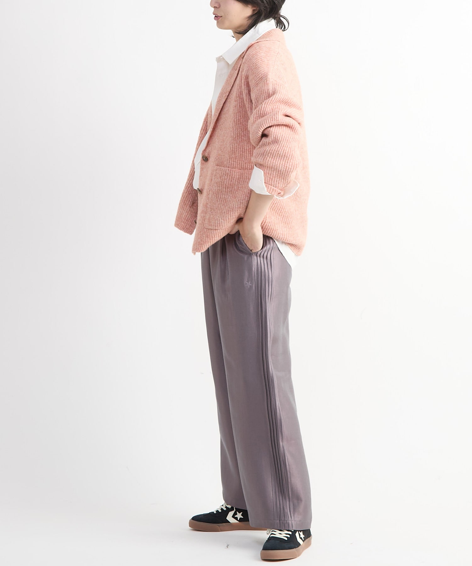 程よいゆとりがありつつも、すっきりとした印象に仕上げているため、女性らしい着こなしにもマッチ。