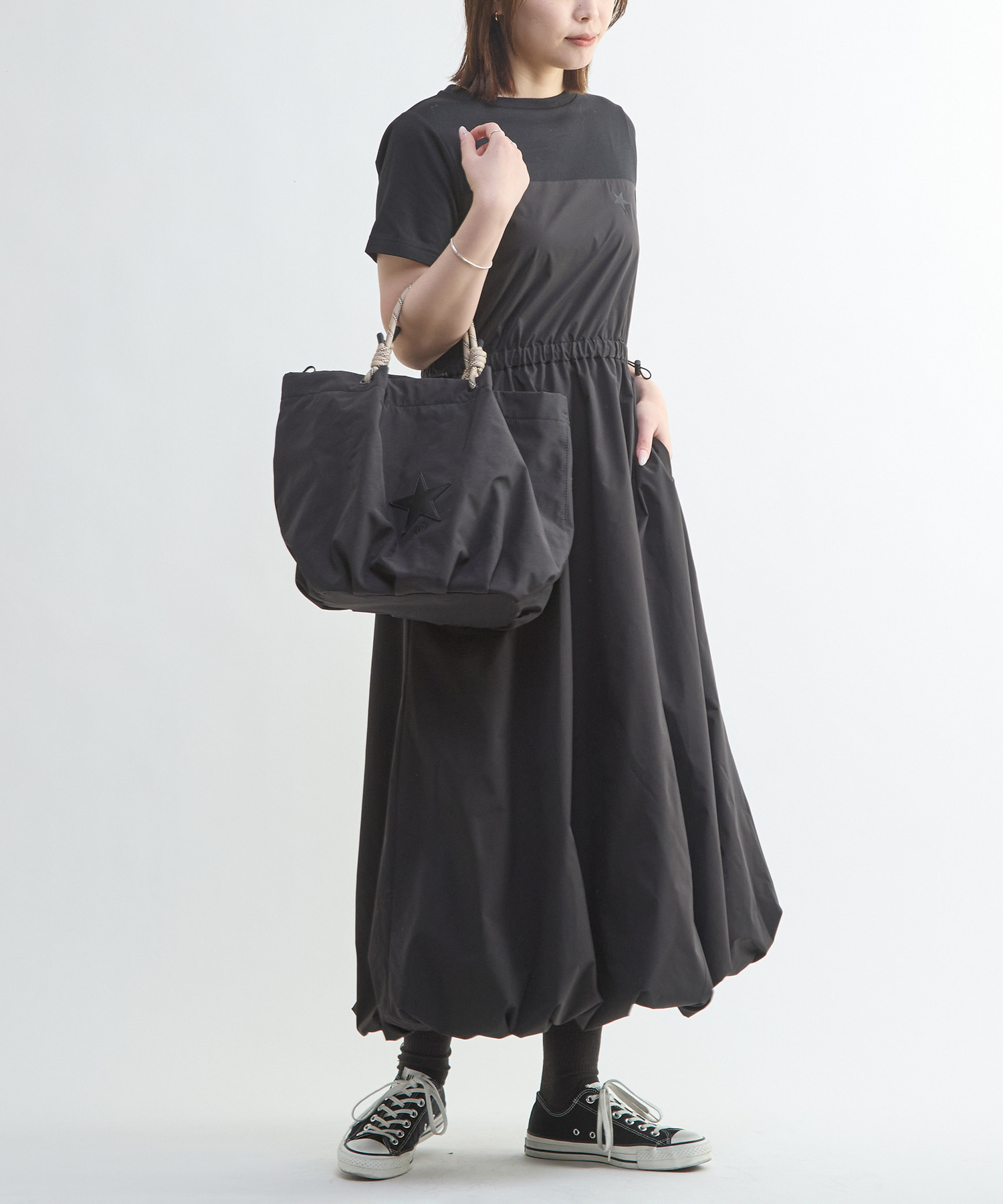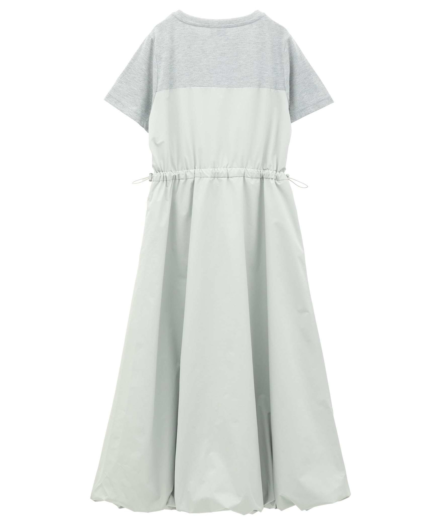 異素材の切り替えと、裾に向かってふんわり広がるバルーンシルエットが特徴的なドッキングワンピース。