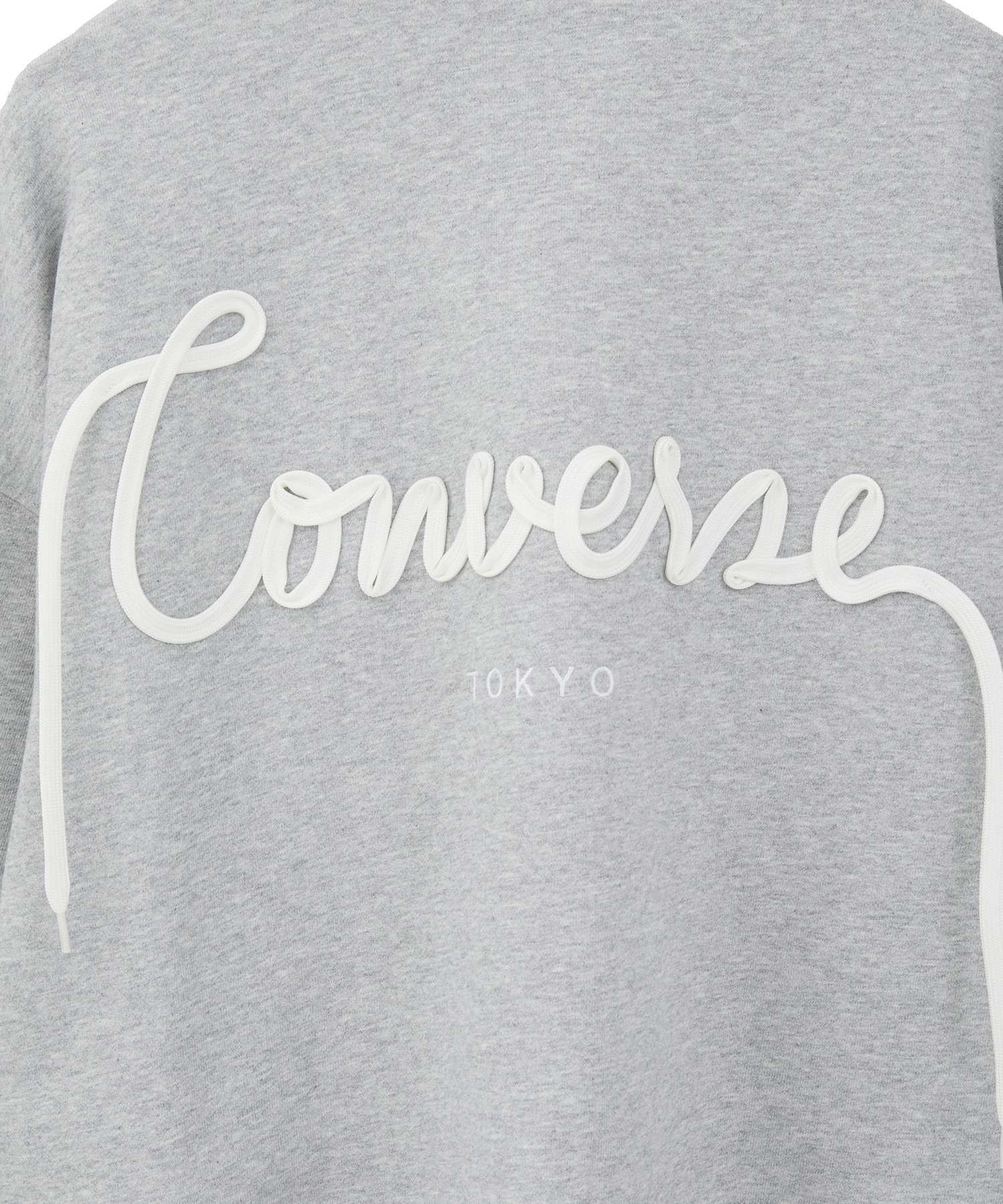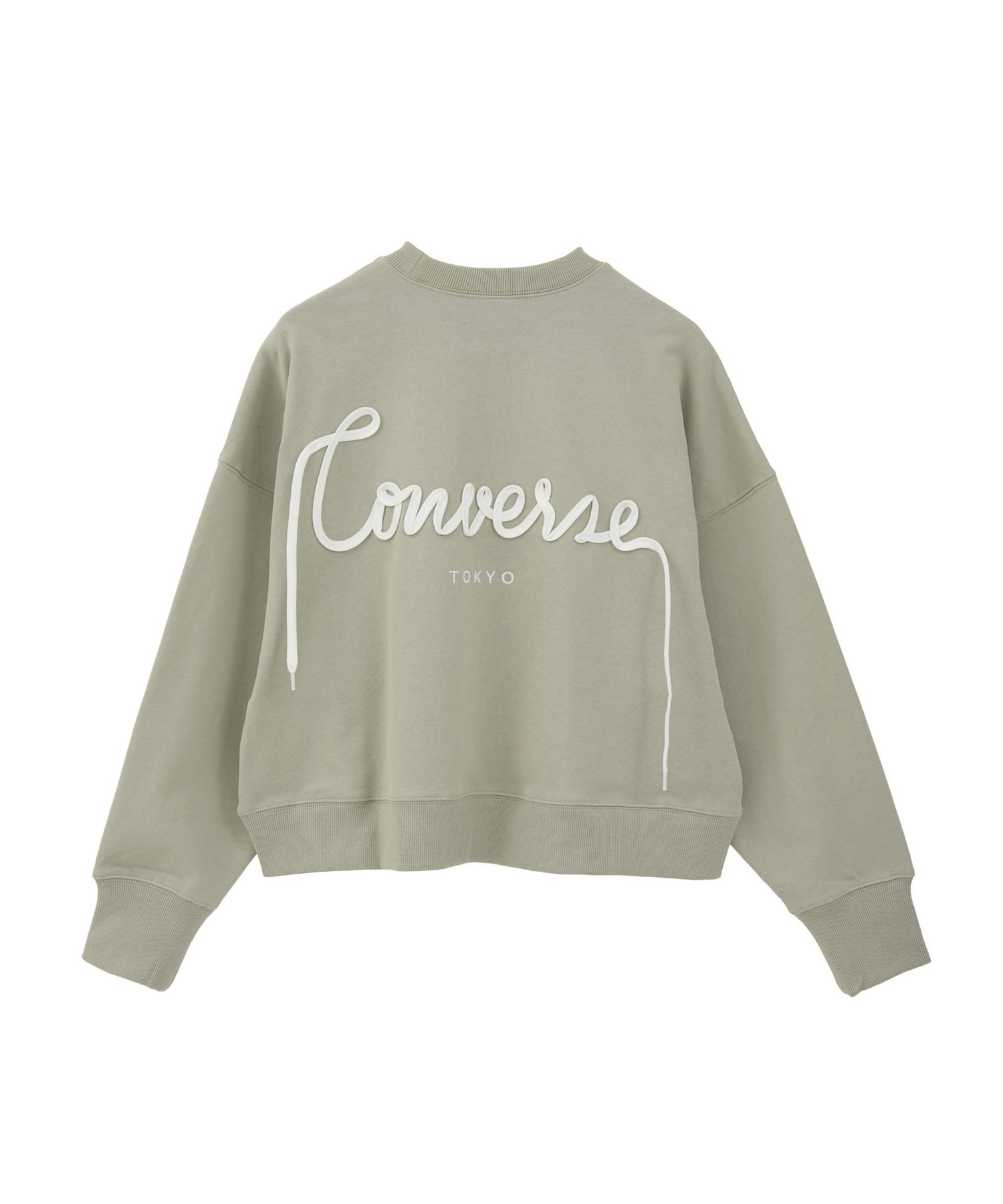 靴ひもを使用したテープ刺繍ロゴが目を惹く、CONVERSE TOKYOならではのデザインスウェット。