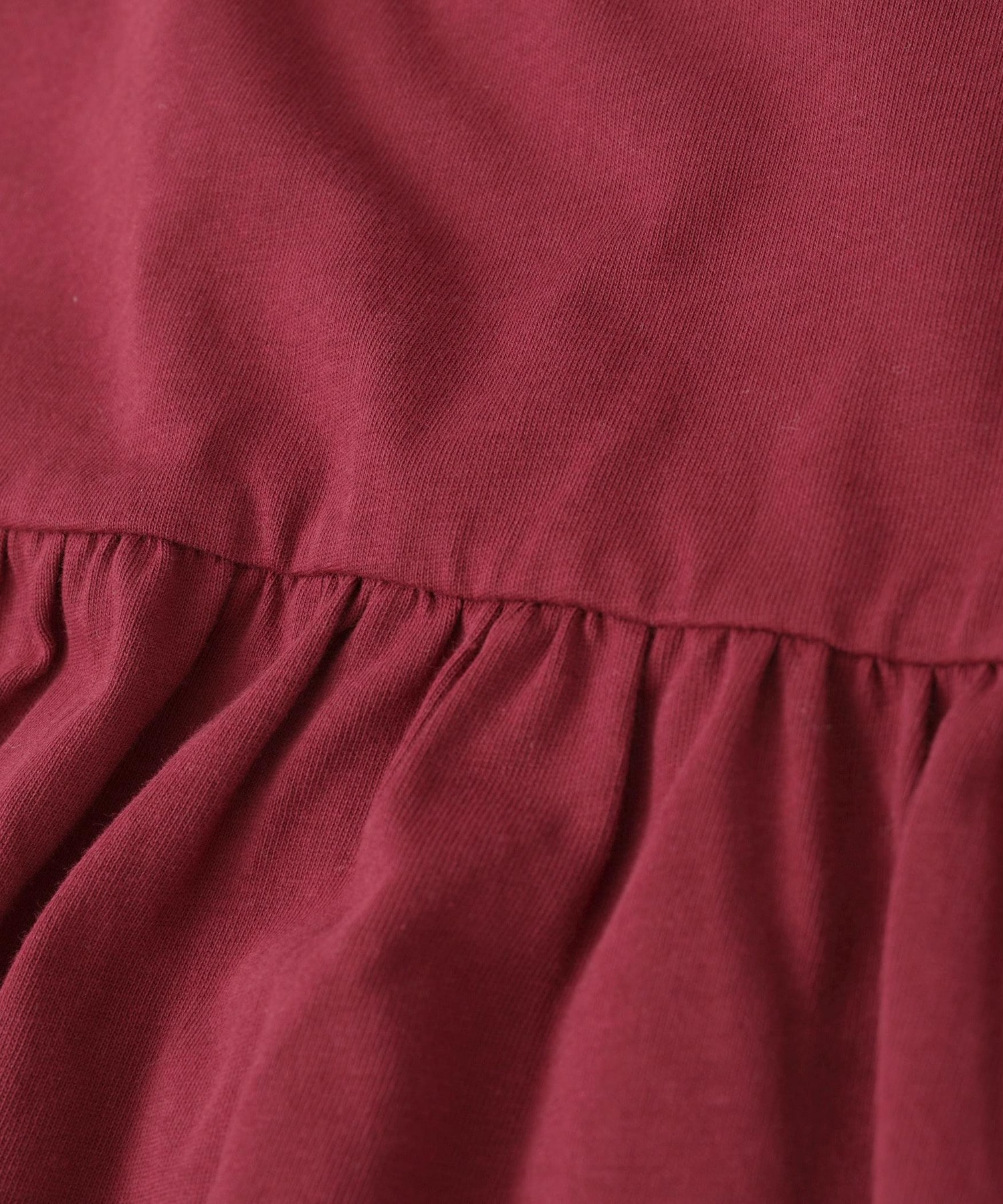 ビスチェ部分はボタンでしっかり固定できるので、動いてもずれる心配がなく、安心して着用いただけるのがポイント。