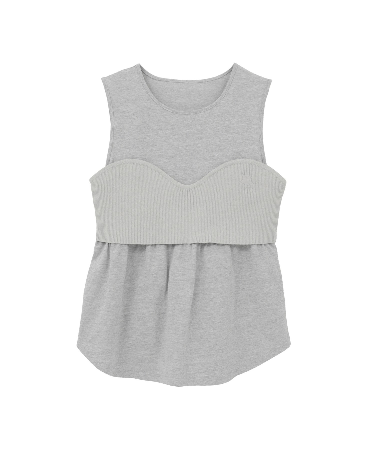 シンプルなタンクトップの上にニット素材のビスチェを重ねた、トレンド感のあるレイヤードトップス。