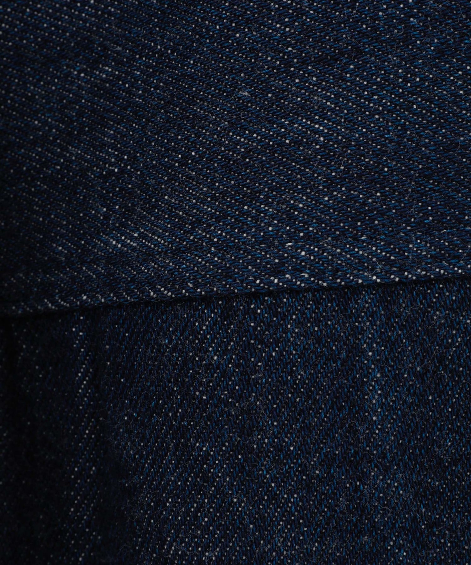 タテヨコともに太番手の5/-糸を用いた12oz甘織りデニムを採用。