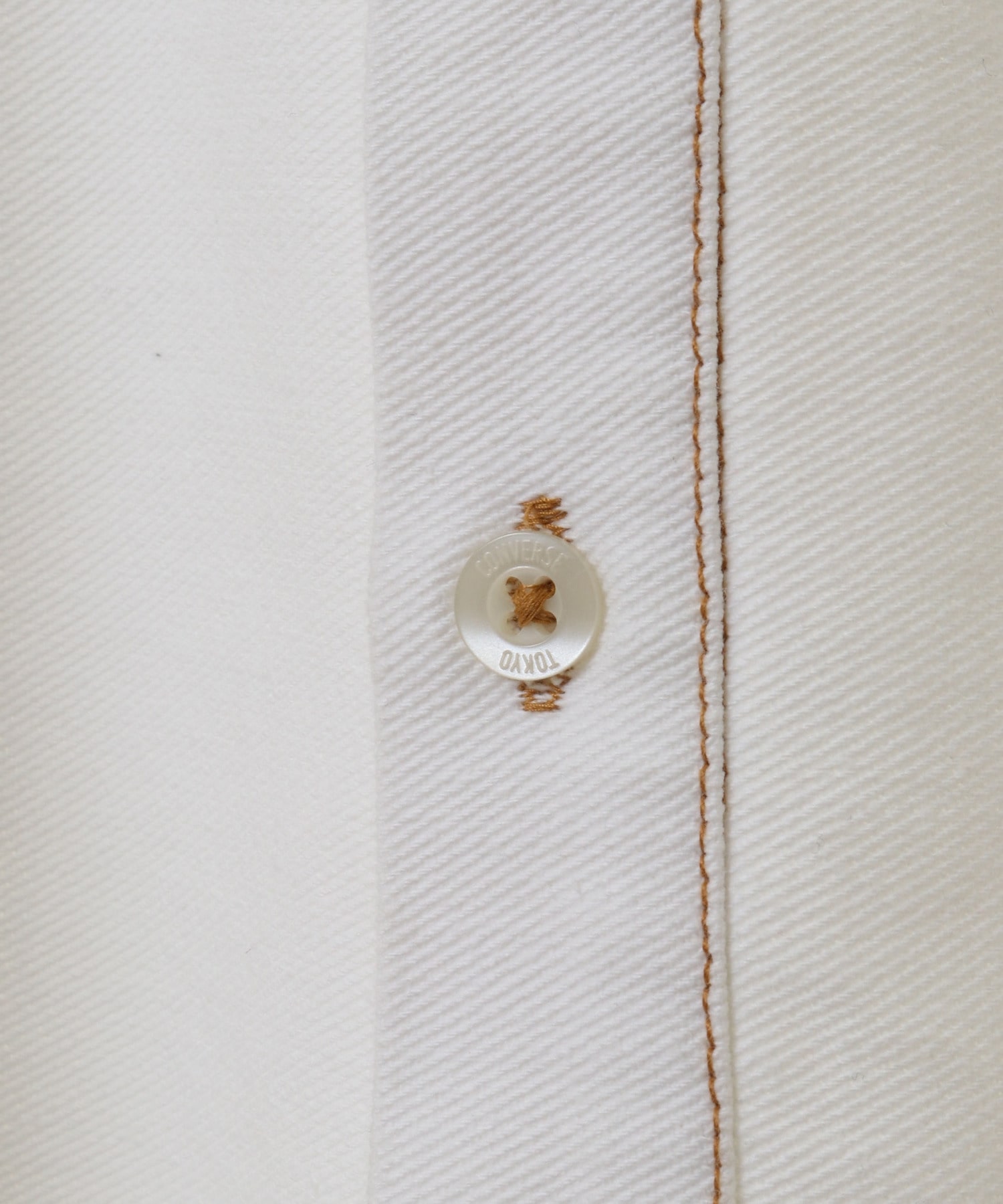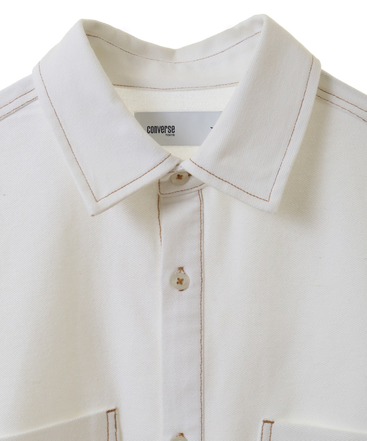 背面の大きな星★パッチと、配色ステッチがポイントのユニセックス仕様のデニムシャツ。