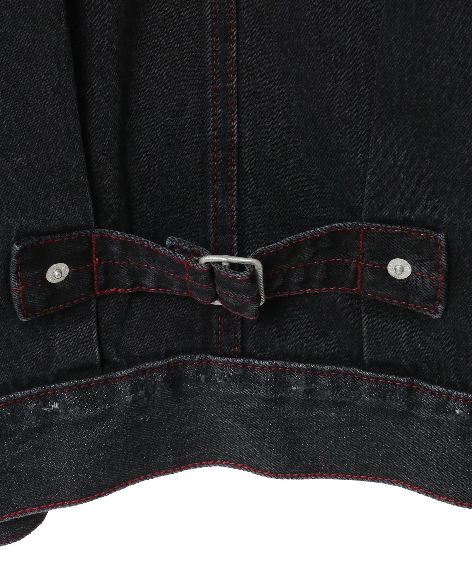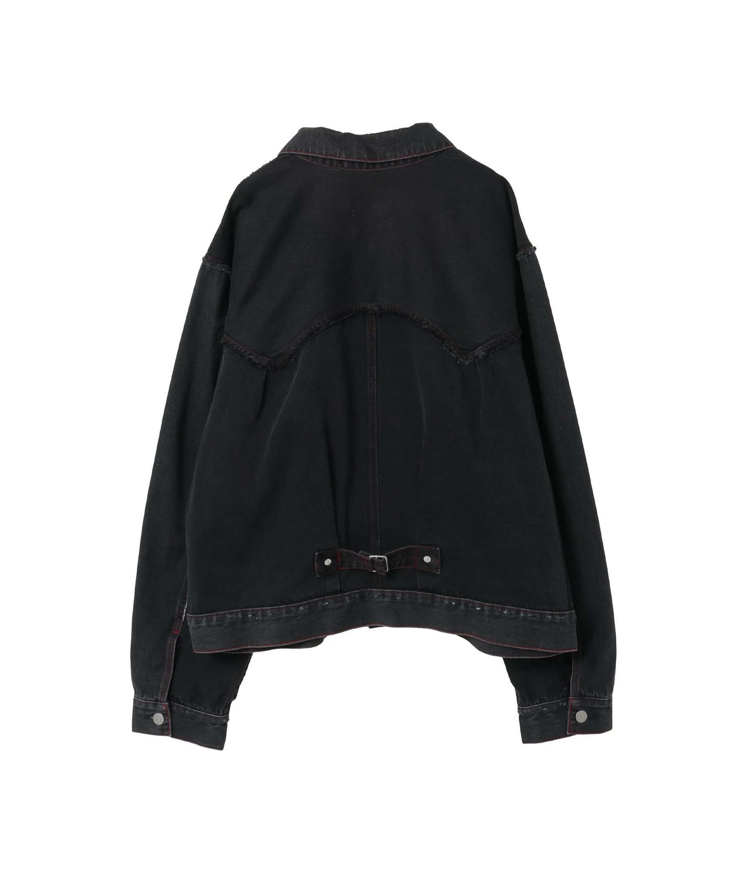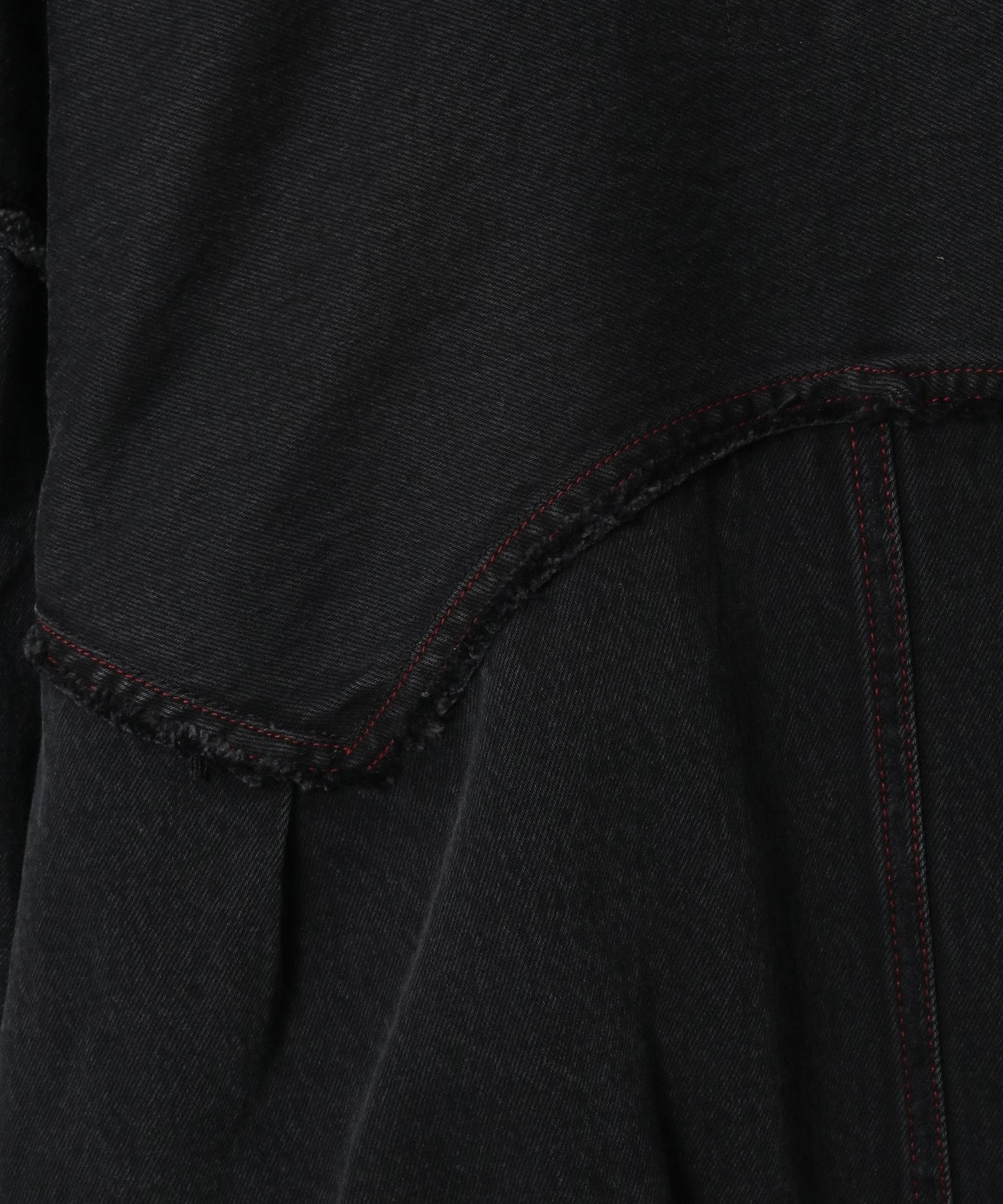 前身頃と後身頃でデニムの濃淡を切り替えたデザインが特徴で、角度や動きによって異なる表情を楽しめる一枚。