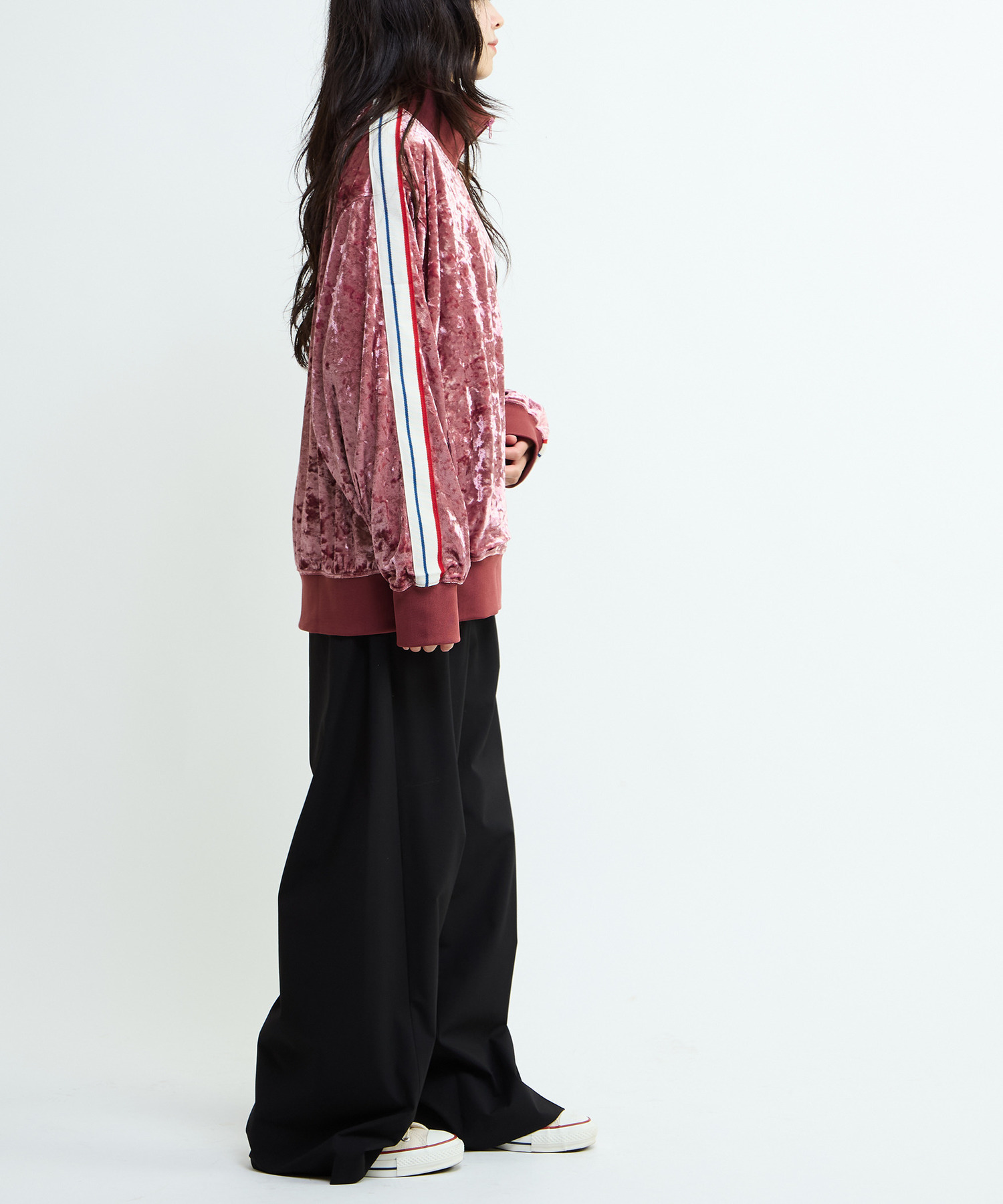 サイドの編立リブにシューズのソールラインをデザインに落とし込んだ、クラッシュベロア素材のトラックジャケット。