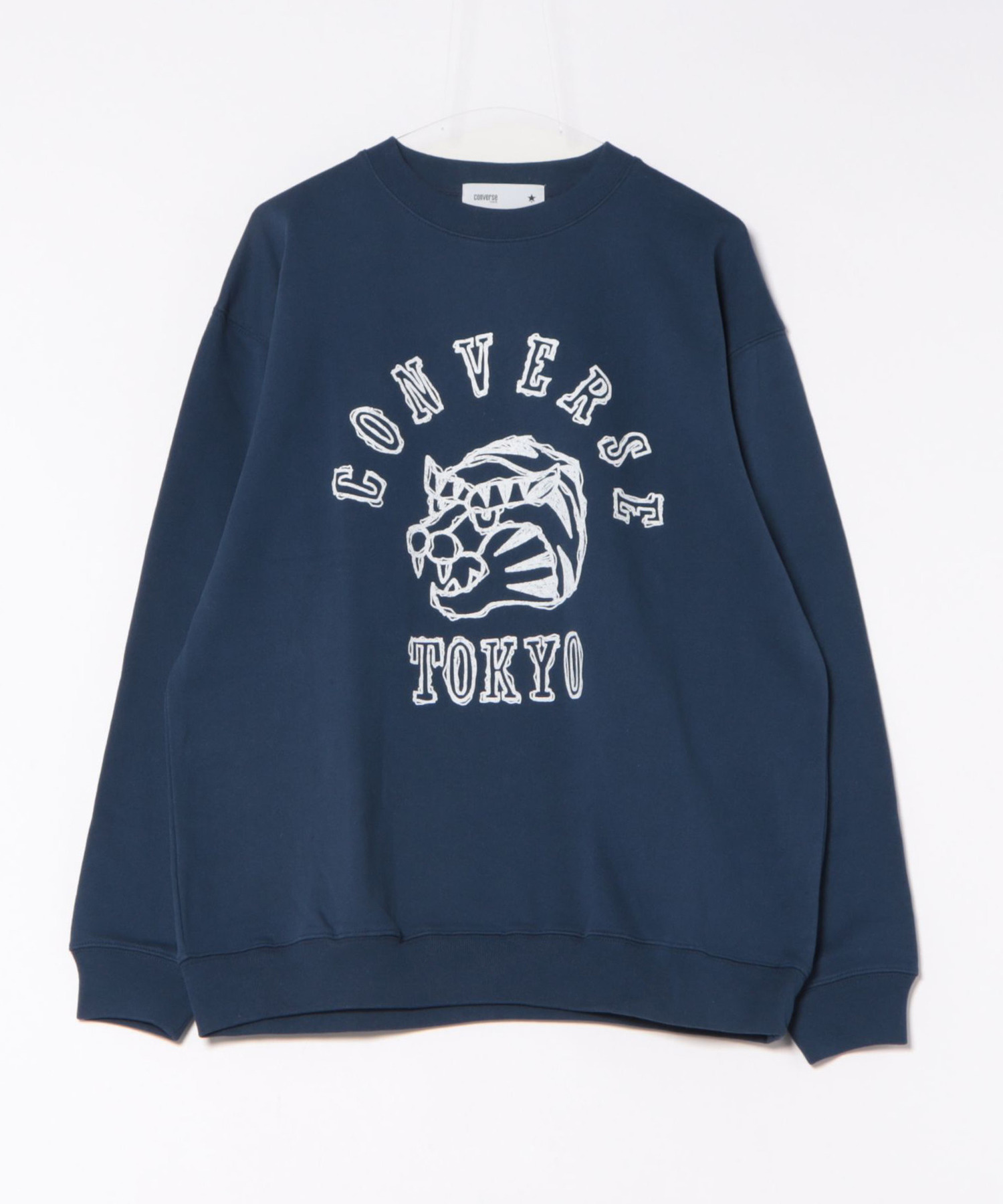 手描き風タッチで描かれたタイガーモチーフと、ロゴを組み合わせたグラフィックスウェット。
