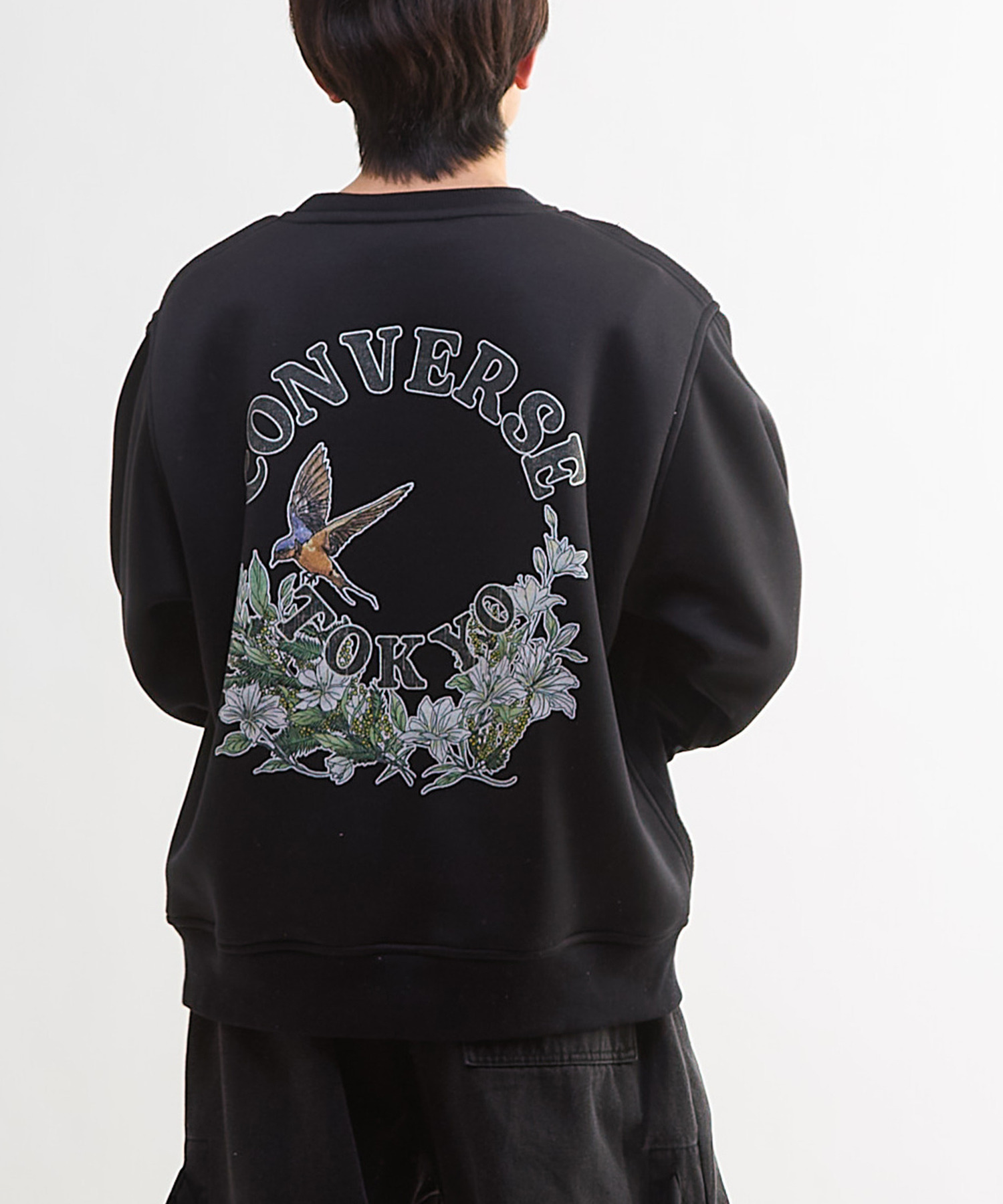 背面には“CONVERSE TOKYO”ロゴとユリの花、幸運の象徴であるツバメを大胆にレイアウトし、存在感のある一枚に。