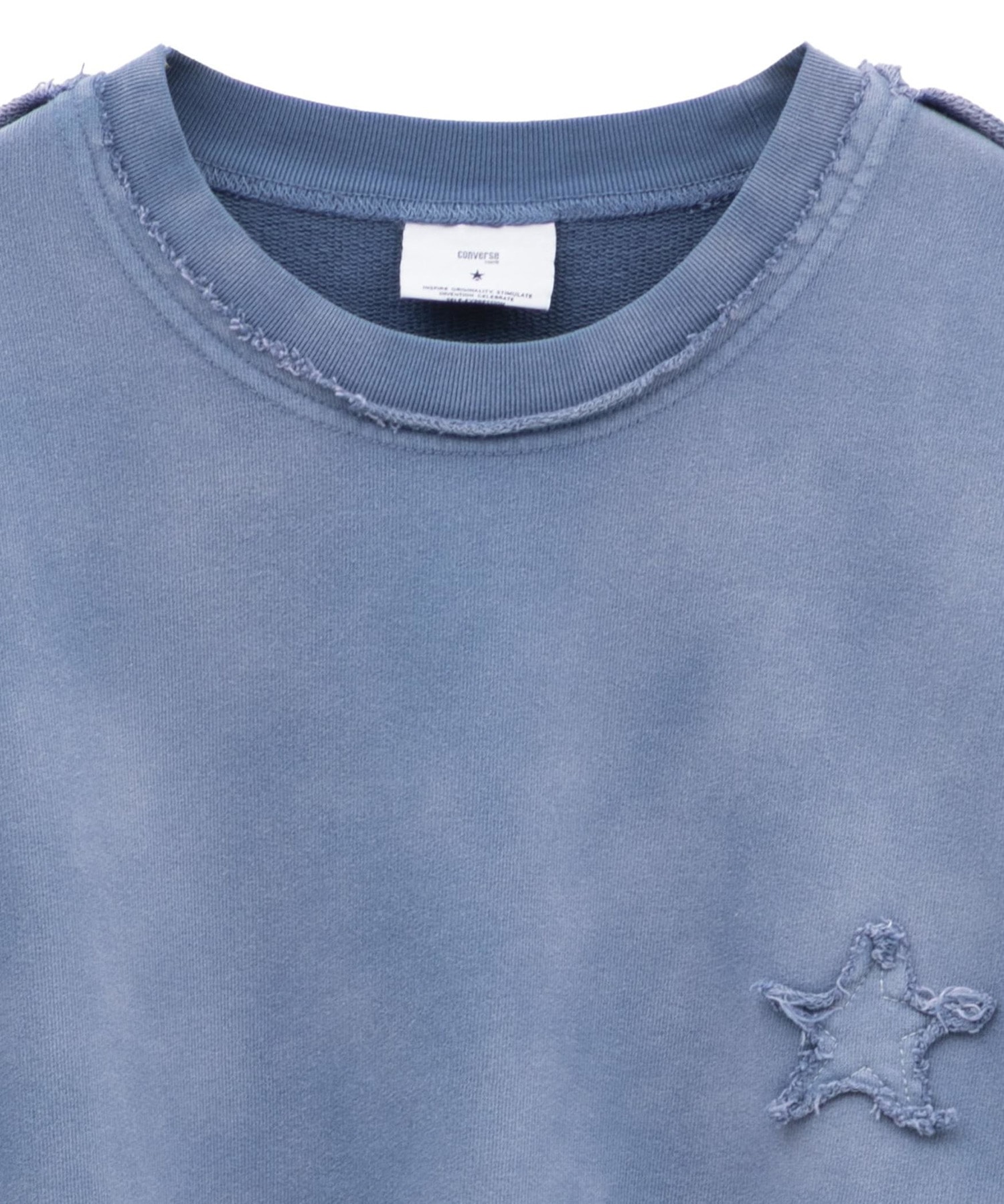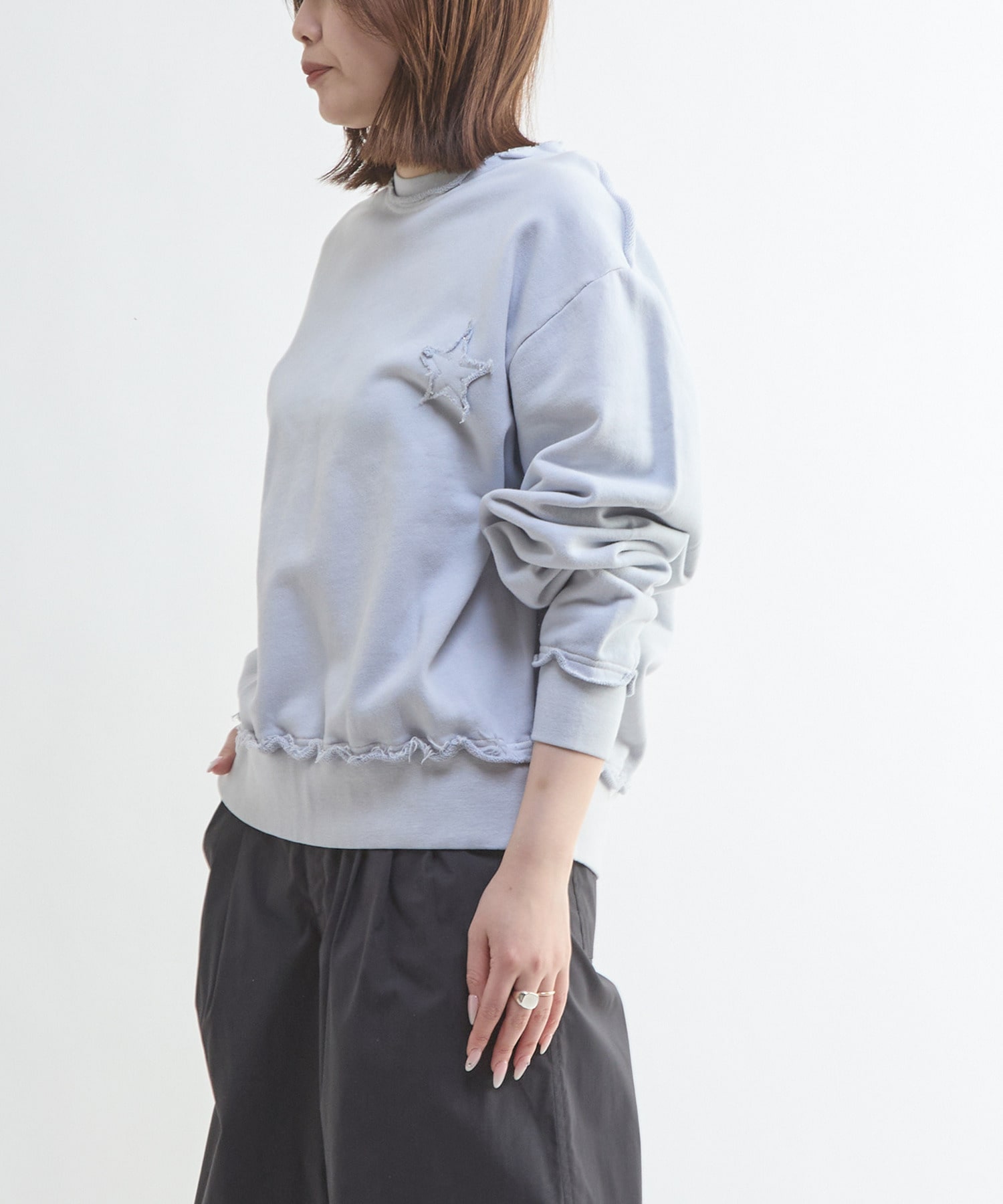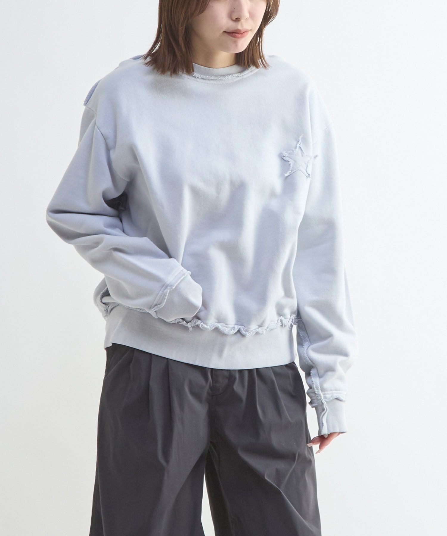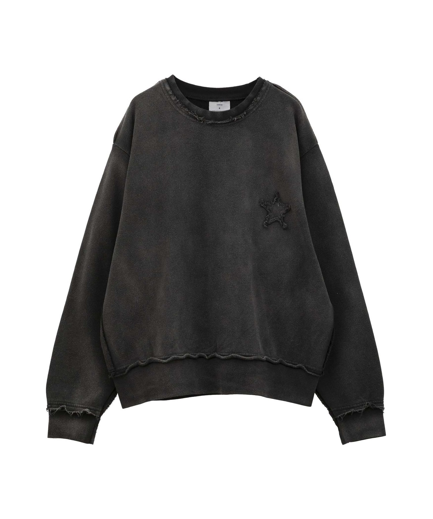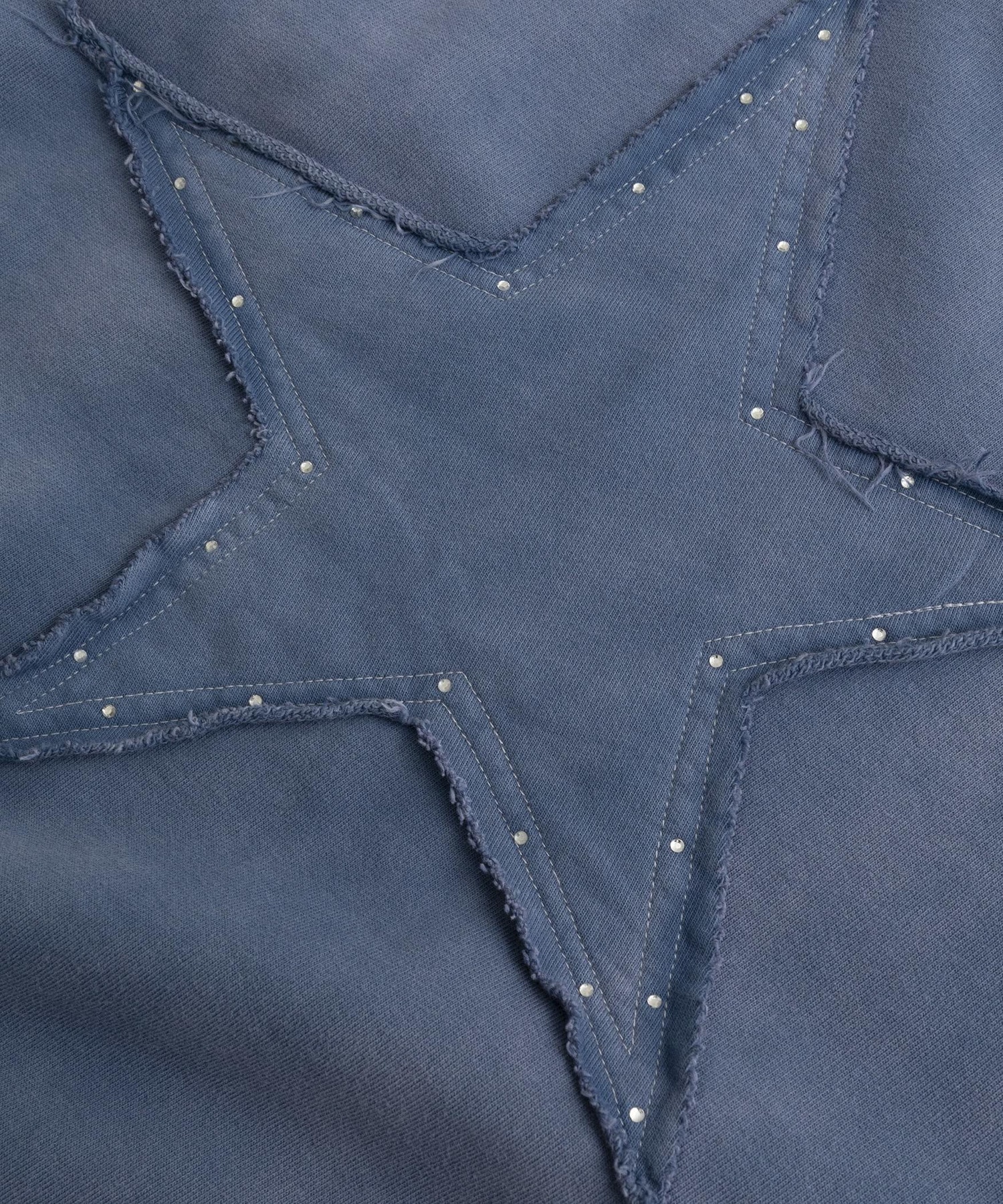 背面に大きく施された星のパッチワークが存在感を放つスウェットプルオーバー。