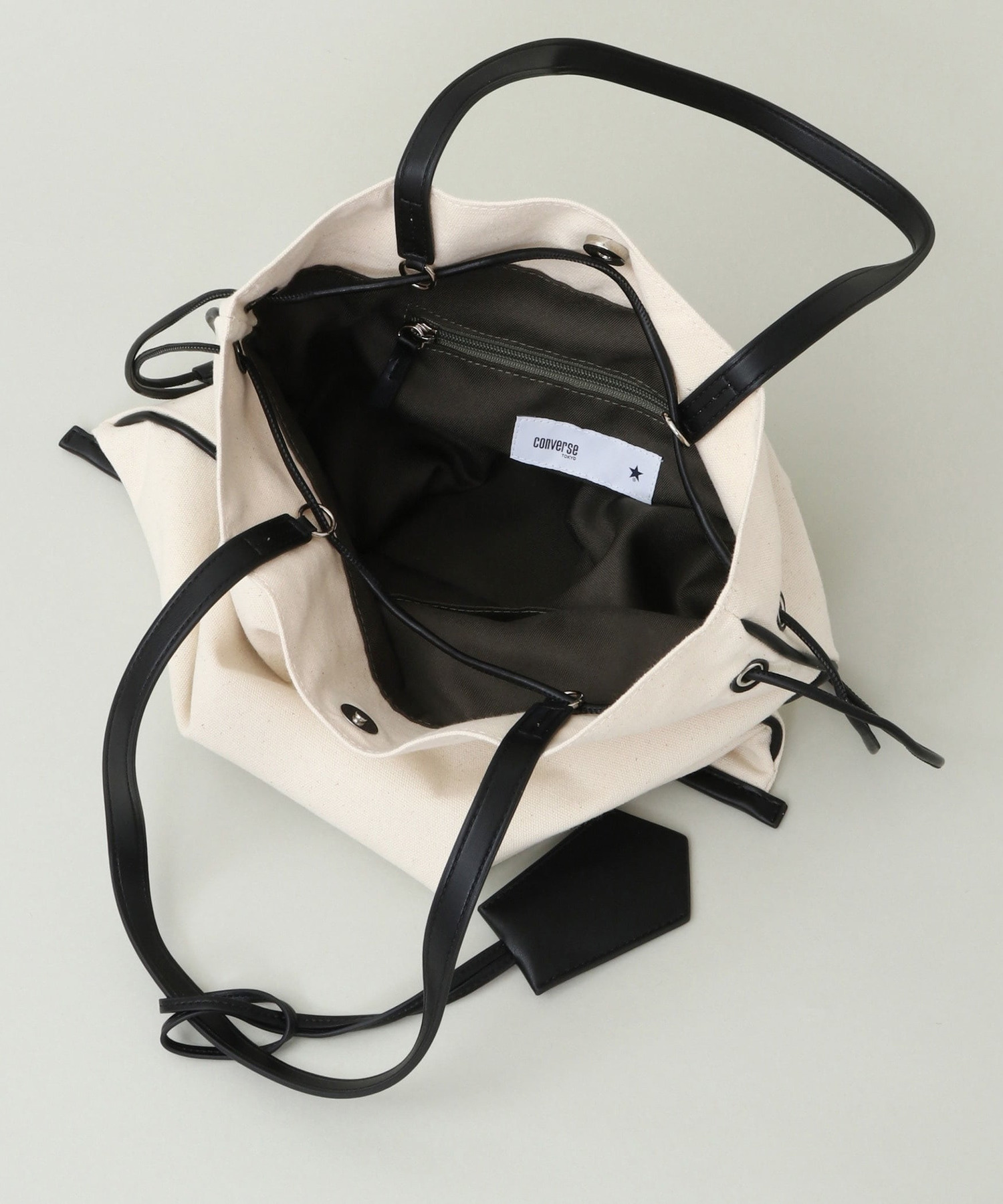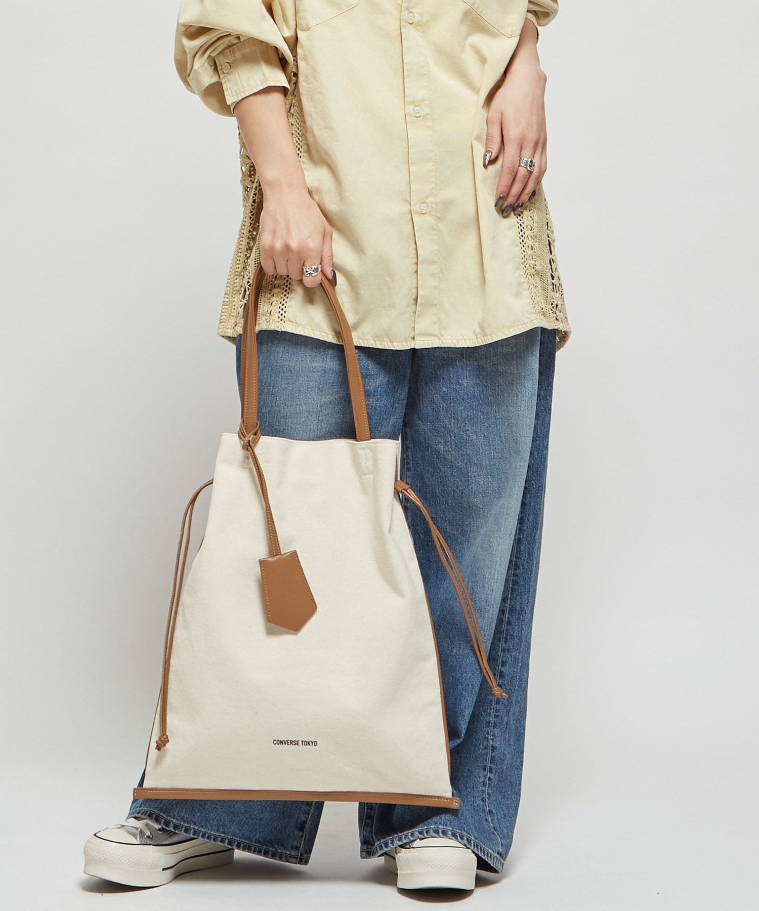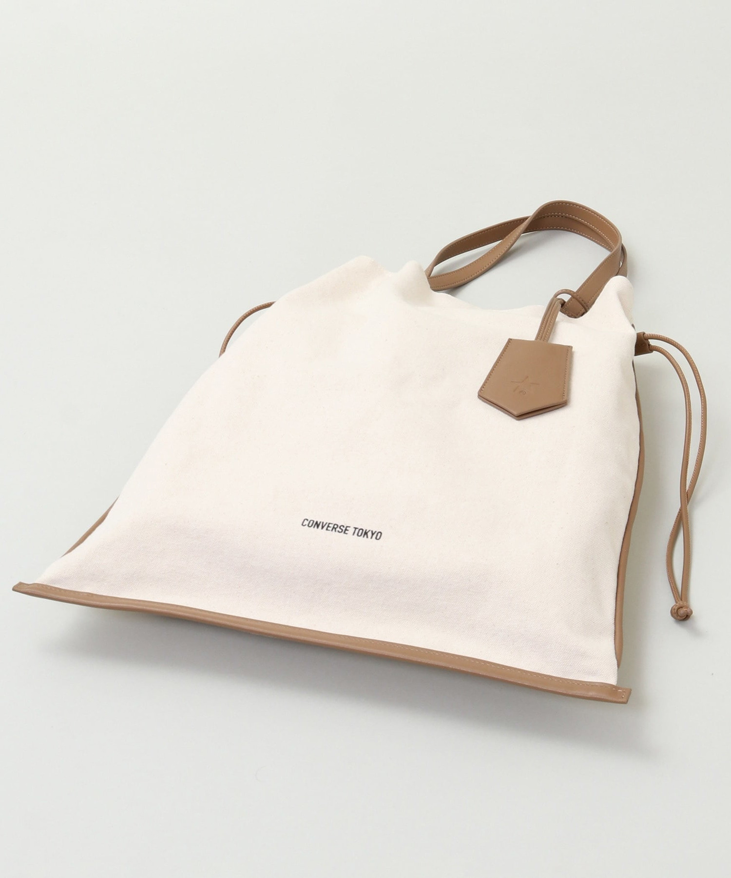 キャンバスベースにヴィーガンレザーを縁取ったトートバッグ。