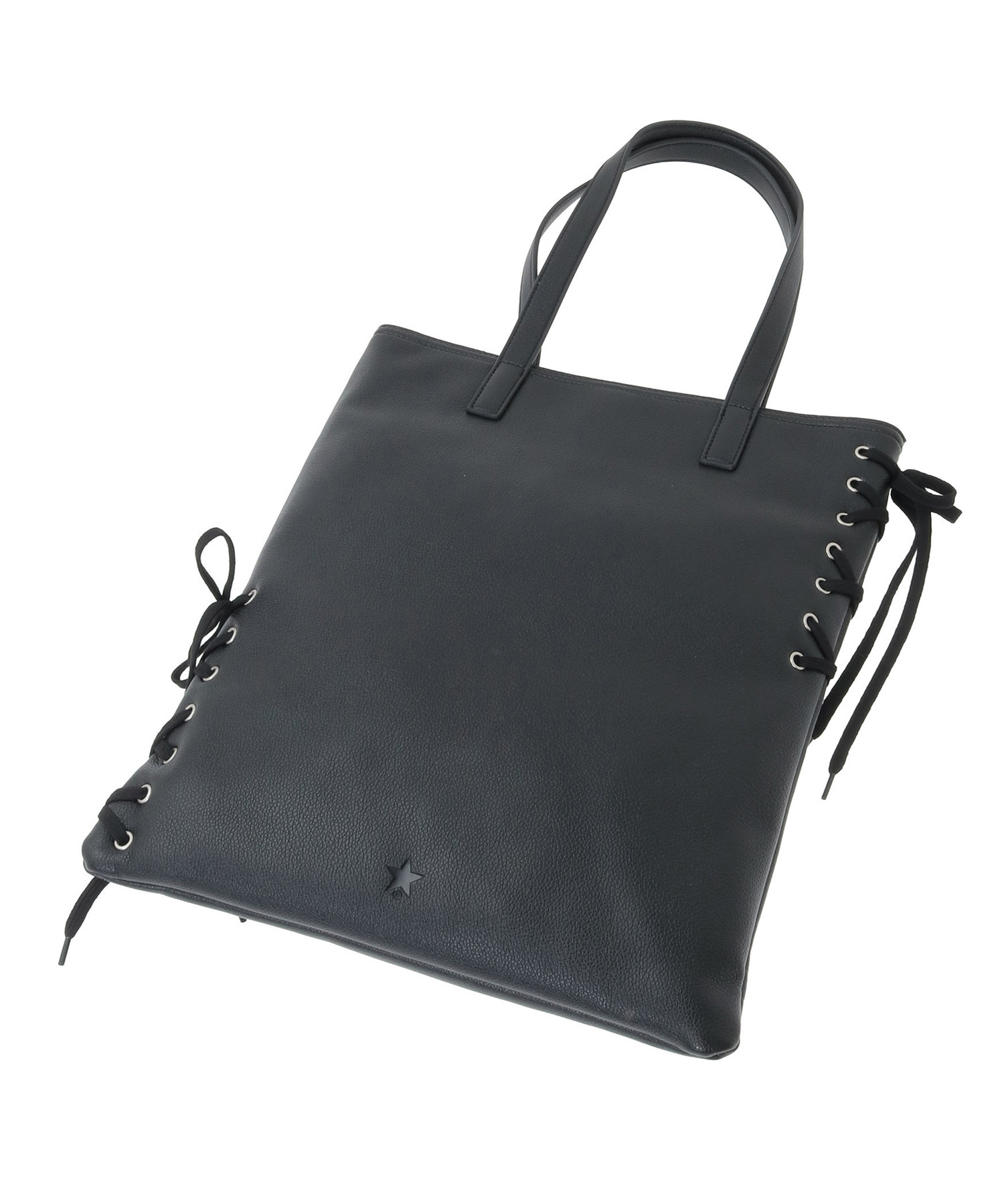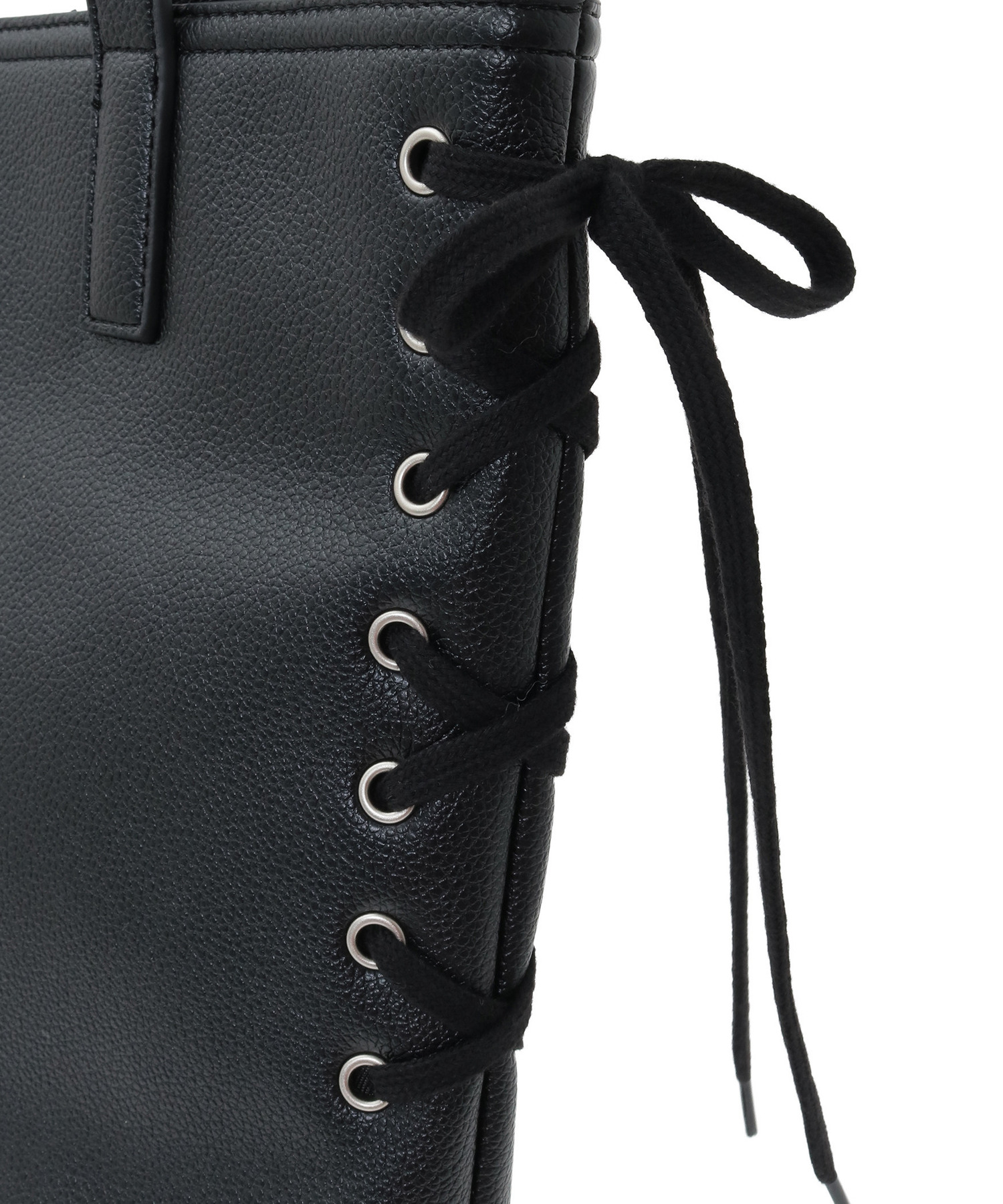 サイドにあしらったハトメとシューレースのディテールが目を惹く、フラットトート。