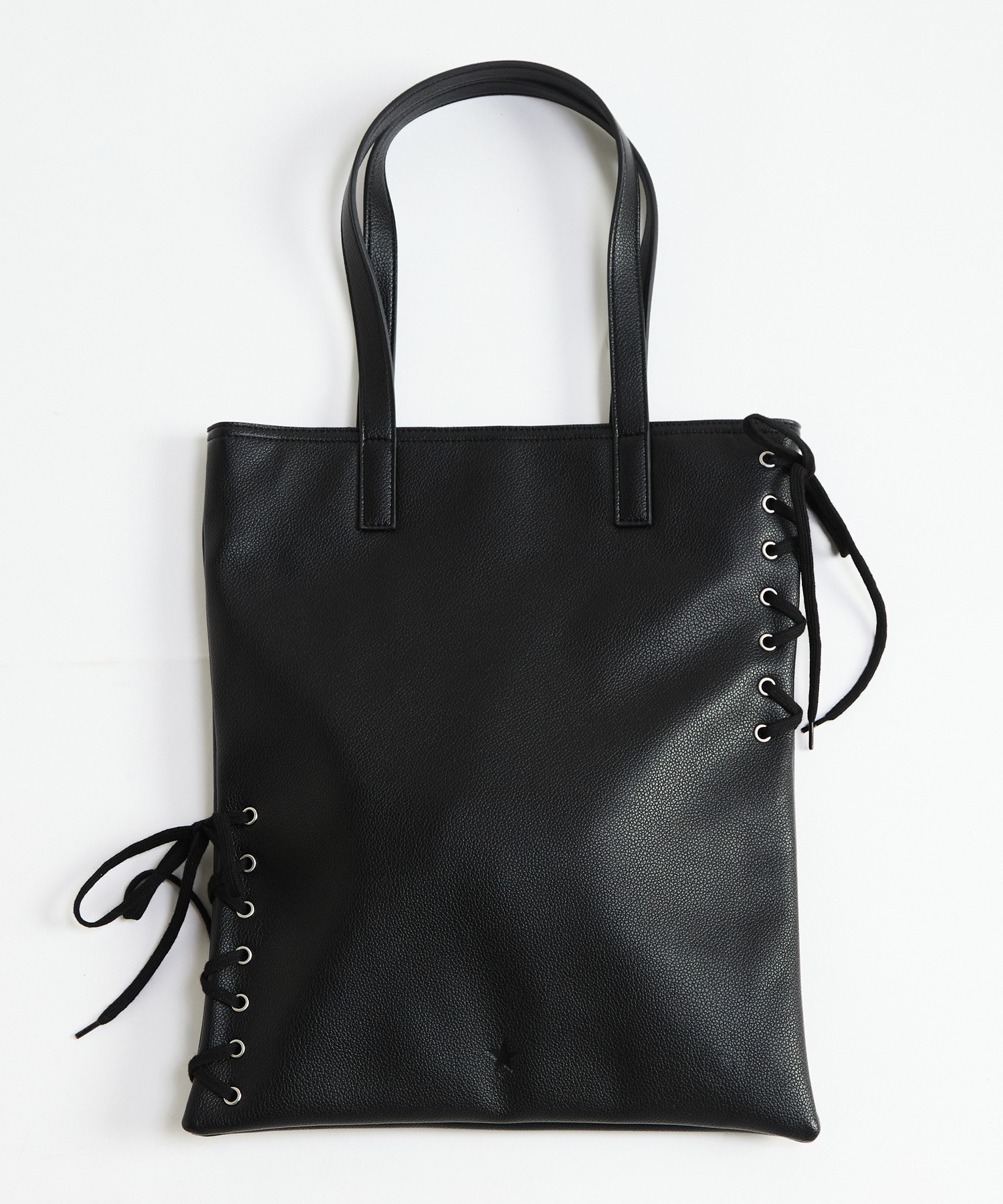 サイドにあしらったハトメとシューレースのディテールが目を惹く、フラットトート。
