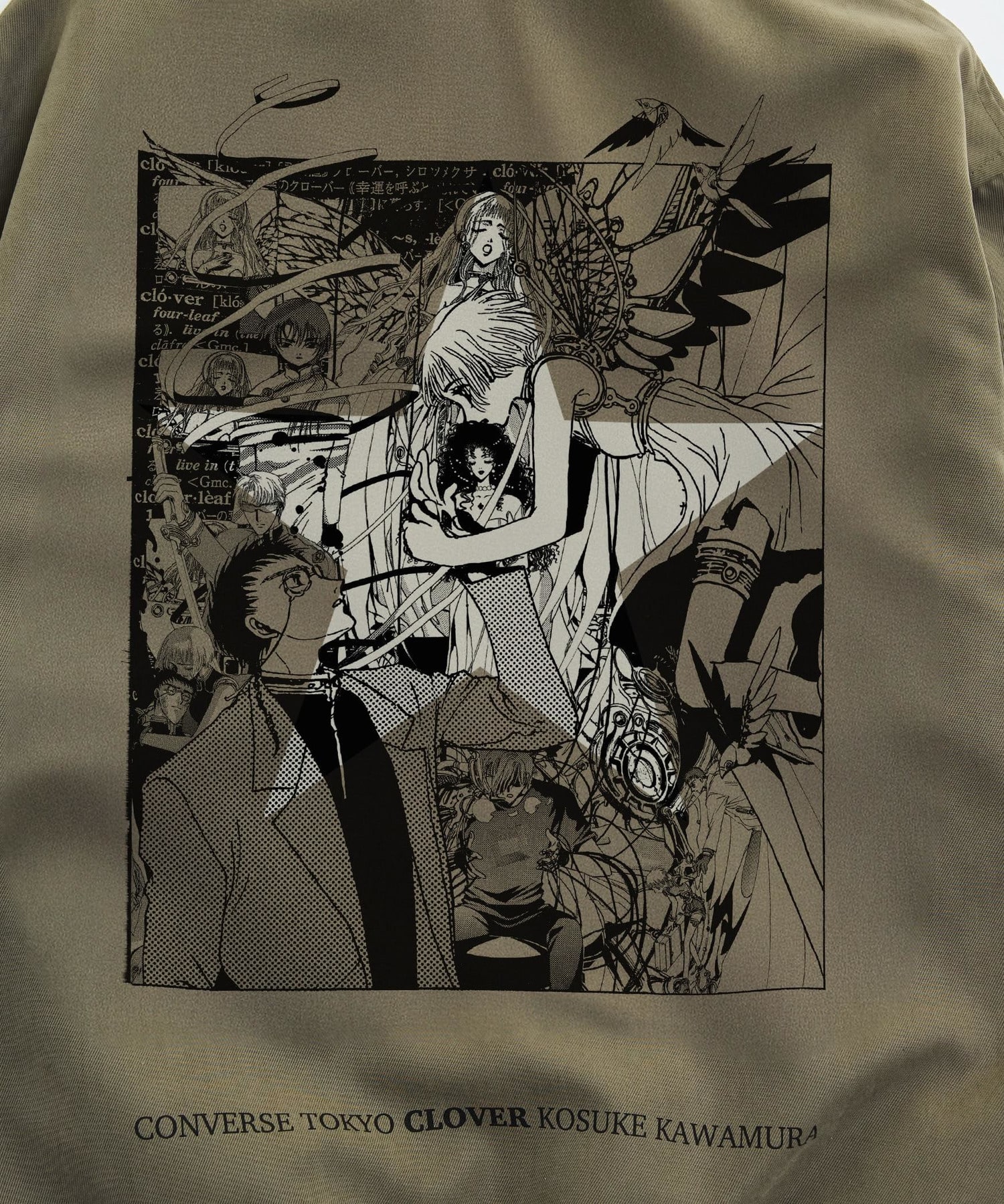アーティスト・〈河村康輔〉のアートワークを基にした、『CLOVER』の物語を閉じ込めたようなグラフィックを、大胆にバックプリントを施したコーチジャケット。