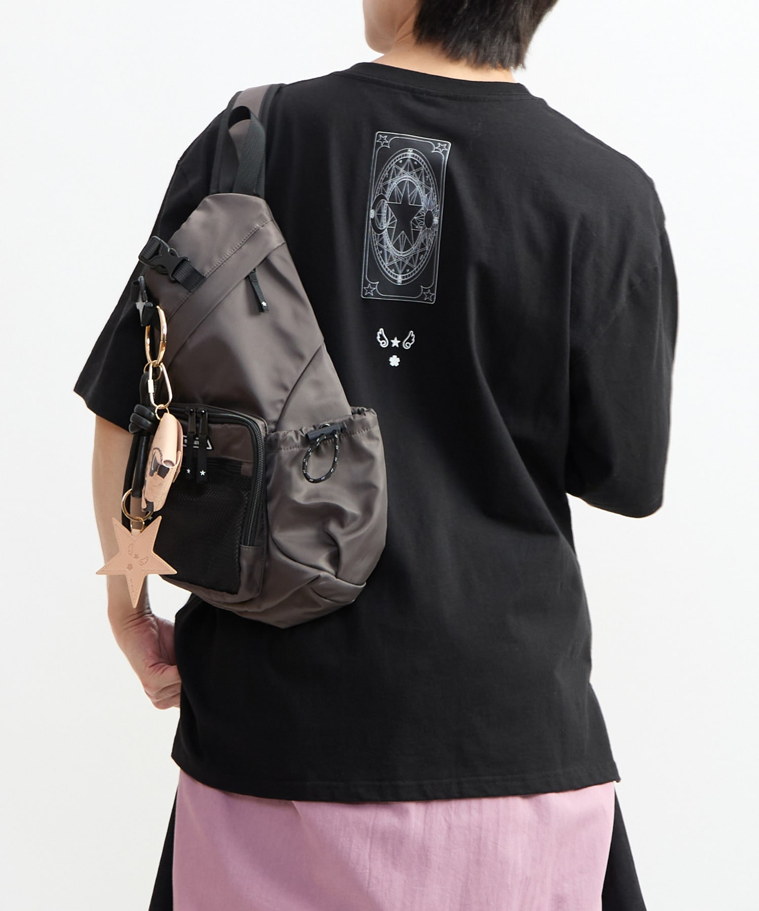 胸元にはカードの表面、背面にはカードの裏面のデザインと『カードキャプターさくら』のキャラクター・〈木之本桜〉を想起させる“桜”と“羽”と星のモチーフを掛け合わせた、スペシャルなアイコンを施し、カードの魔力をその身に纏うような一着に仕上げました。