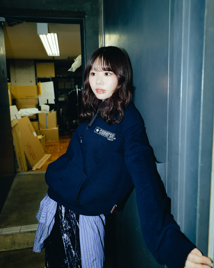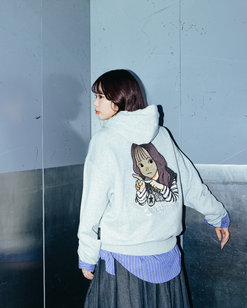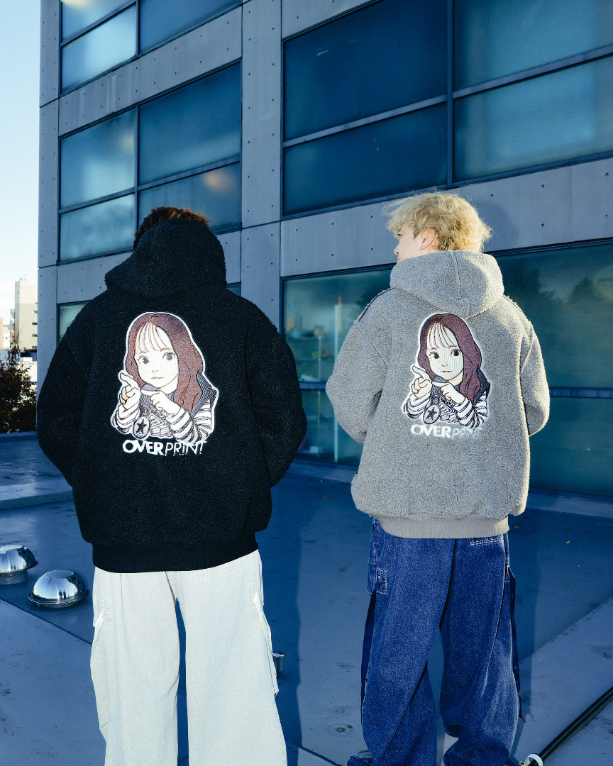 今回のキービジュアルとして登場するのは、人気イラストレーター・『COTOH』が本コレクションのために描き下ろした、UNFAIR RULEの山本珠羽(Vo./Gt.)さんのイラストです。繊細な表情のニュアンスまで描き込まれたアートワークを、ボアフーディーとフーディーの背面に刺繍で落とし込みました。刺繍の厚みや糸の光沢まで細部にこだわり、立体的な陰影によってグラフィックの輪郭が一段と映える仕上がりに。さらに、両ブランドのロゴをあしらったシャツもラインナップ。袖にはドローコードでギャザーを寄せられるため、シンプルなデザインにストリートらしいラフなムードをプラスできるアイテムです。
